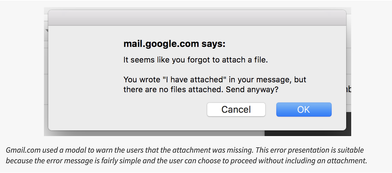 당신이 더 강한 주목을 앞으로 발생할 에러메시지에 끌어야 할 때 당신은 모달 또는 확인 메시지 팝업으로 사용자가 해결해야 하는 이슈에 대해 자세하게 설명하고 해결할 수 있도록 도울 수 있다. 하지만 두 가지 불리한 점 (1. 이런 팝업이나 모달뷰는 사용자의 작업을 방해할 수 있다. 2. 이런 에러메시지들은 팝업창안에서 보이기 때문에 팝업창 메시지 안에 있는 내용을 외우고 창을 닫은 다음 오류를 수정해야 해서 사용자의 인지에 과부하가 생긴다. 기억을 못 하게 되면 다시 창을 띄워줘야 하는데 이 또한 비효율적이다.) 때문에 이런 모달 또는 팝업 메시지를 사용하는 것을 최소화한다. 그러나 만약 에러 메시지가 간단하고 에러가 있는 상태로 제출이 될 수도 있는 상태라면 모달 또는 팝업을 이용해도 된다.