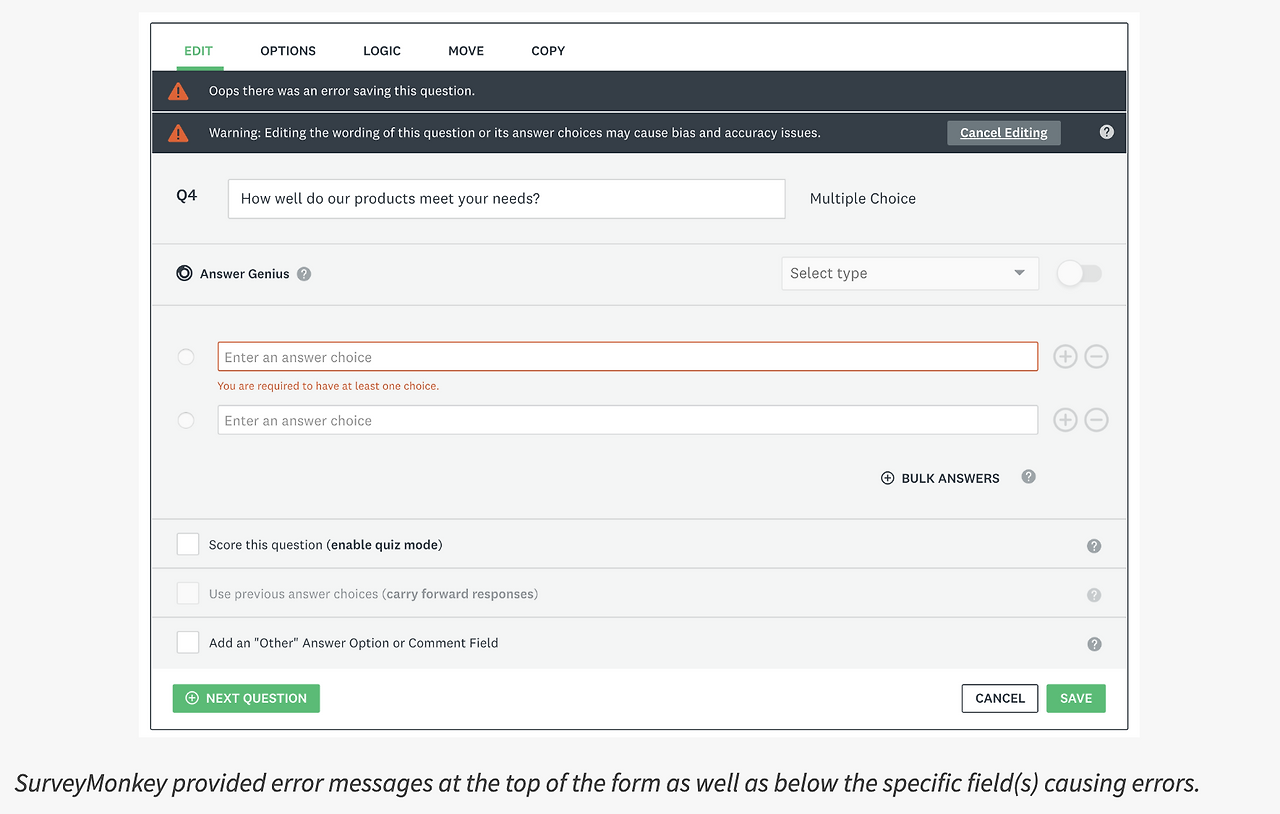 만약 같은 오류가 반복해서 (반복의 기준은 3번 또는 그 이상 한 개의 폼을 작성하는 시도를 하는 것을 말한다) 발생한다면 이것은 사용자 인터페이스에 심각한 문제가 있다는 징후이다. 당신이 제공하는 에러메시지가 문제를 해결하기에는 불충분하거나 사용자의 니즈와 디자인이 맞지 않는 것일 수도 있다. 계속 이야기했듯 사용자가 에러를 발생시켰을대 이것은 그들의 잘못이 아니다. 에러를 부르는 디자인을 만든 디자인 잘못이다.