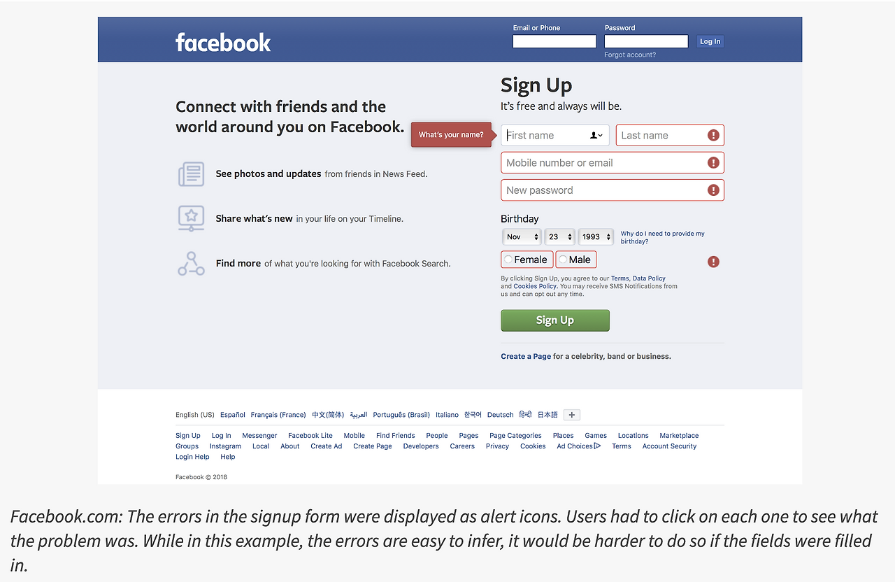 일반적으로 우리는 이런 에러 표시 방법에 대해서 찬성하지 않는다. 먼저 몇몇의 경고 아이콘을 알아보기가 어렵고 두 번째로 사용자가 해당 필드가 무엇 때문에 에러가 발생했는지 궁금한 부분을 알아내기 위해 호버 또는 클릭을 해야 하는 추가 단계가 필요하기 때문이다. 만약 사용자가 호버나 클릭을 해야 하는지 모른다면 에러 내용을 알 방법이 없다. 세 번째로 왜 사용자가 에러 메시지를 보기 위해 더 많은 작업을 해야는지.. 합리적인 이유가 없다.
