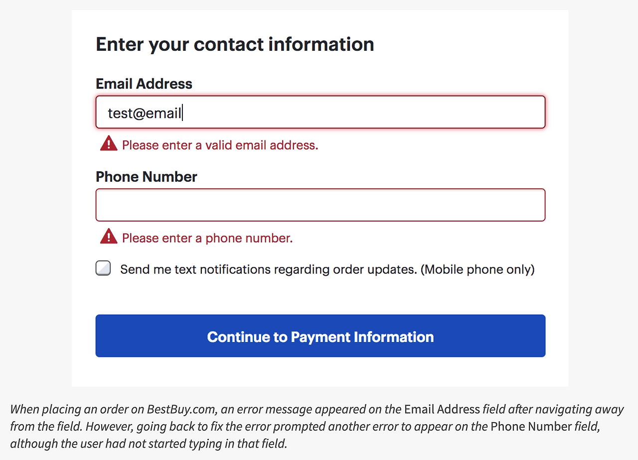 이상적으로 모든 검증은 즉시 되어야 한다. 사용자가 필드 채우는 것을 끝내자마자 검증된 내용이 보여야 하는데 만약 필드에 적힌 내용에 에러가 있다면 바로 보여야 한다. 이런 타입의 에러 메시지는 쉽게 알아볼 수 있어야 할 뿐 아니라 에러를 즉시 필드를 채우자마자 고칠 수 있도록 하여 불필요한 인터렉션 낭비가 최소화되어야 한다. 사용자들은 에러 메시지들을 찾거나 에러메시지가 표시되는 필드가 어딨는지 탐색할 필요도 없고 사용자들이 성공적으로 입력했다고 생각했던 이전 필드로 돌아가기 위해 새로운 필드에 다른 내용을 적어볼 필요도 없다.