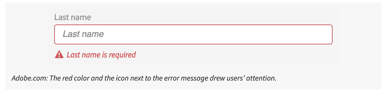 빨간색 컬러는 에러 메시지 표기 컬러로 자주 사용되고 있고 주황색 또는 노란색은 경고를 나타내는 색으로 초록과 블루는 성공을 의미하는 컬러로 자주 사용된다. 분명하게 결과를 나타내는 텍스트가 나머지 폼의 색상보다 눈에 띄는 컬러로 적용해서 사용자가 빨리 알아차릴 수 있도록 해라. 많은 폼을 채워야 하는 긴 페이지의 에러 필드 부분에는 반불투명의 백그라운드를 추가해서 에러 필드를 빨리 찾아낼 수 있도록 해라.