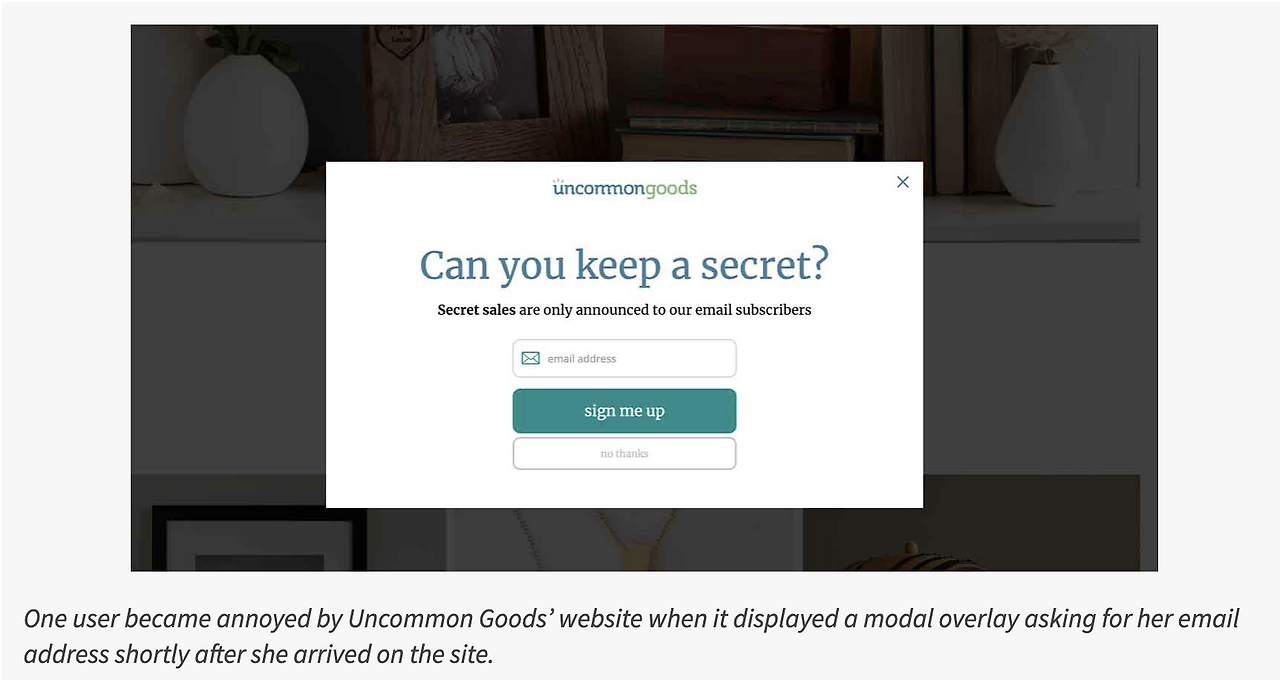 예를 들어 한 사용자가 아래 예시처럼 웹사이트에 방문하였는데 비밀 판매에 접근하기 위해서 이메일 주소를 묻는 모달 오버레이를 보게 되었을 때 불만이 생겼다. 이 사용자는 "웹사이트에서 하려던 작업을 시작하기도 전에 이런 것들이 뜨는 것은 정말 짜증 난다. 내가 이제 막 이 사이트에 접속을 하게 되었는데 내가 이메일 구독자가 되고 싶은지 어떻게 알 수 있겠는가? 저는 이 팝업을 사이트를 둘러보고 나서 조금 있다가 받고 싶다."라고 말했다.
