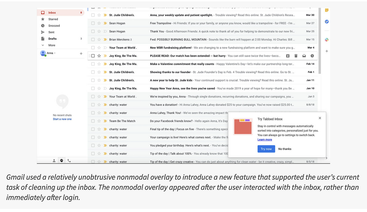 대신해야 할 것 : 사용자에게 시간을 주고 그들이 작업을 완수할 수 있도록 여유를 준 다음에 팝업을 노출시킨다. 사용자 계정에 대한 팁, 가이드, 또는 새로운 기능에 대한 정보를 일정 시간이 지난 다음 보여준다면 수용가능한 팝업 내용이 된다. 어느 정도 시간이 지나면 결국 유용한 계정 팁, 안내 또는 새로운 기능을 제시하는 것은 괜찮지만 제시된 콘텐츠 또는 새로운 기능에 의해 사용자의 작업이 향상되거나 추가로 지원되는 경우에만 팝업으로 보여준다. 이러한 경우에는 덜 거슬리는 툴팁 또는 작은 비모달 오버레이로 보여주어 상호작용 할 수 있도록 하는 것이 좋다