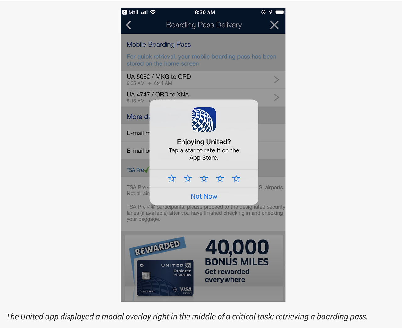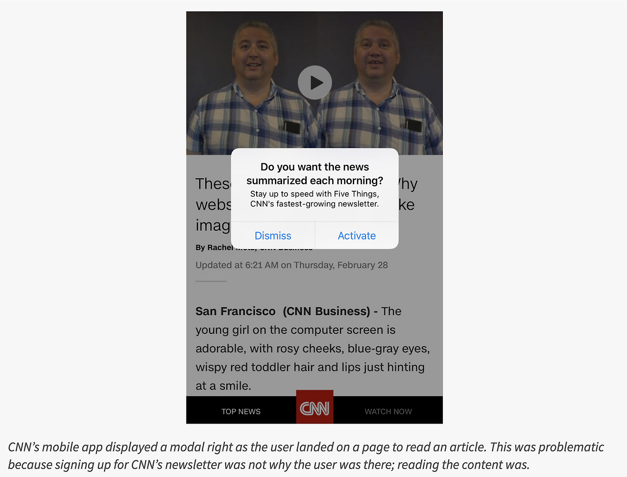 8. 모달오버레이를 통해 콘텐츠에 접근하도록 방해하는 것 : 모달 대화상자가 사람들이 아티클 또는 긴 콘텐츠 (어바웃어스 또는 뉴스 섹션)을 로드 하자마자 나타나는 것은 이 사이트가 콘텐츠에 접근하는 것에 조건이 있는 것처럼 보이게 한다. 이러한 대화상자는 신뢰를 잃어버리게 하기 때문에 잘못된 곳에 위치한 것이다. 한 사용자가 CNN 모바일 앱에서 사용자가 뉴스레터 모달오버레이 화면이 아티클이 로드되자마자 계속 보게 되니 점점 답답함을 느끼게 되었다. 그는 '이렇게 로드가 되자마자 모달오버레이가 계속 뜨니 CNN 뉴스레터 서비스에 대한 의심이 최고에 이르렀다. 나에게 이메일 또는 가입에 대해서 아티클이 뜨자마자 바로 물어보지 말아라.'라고 말했다.