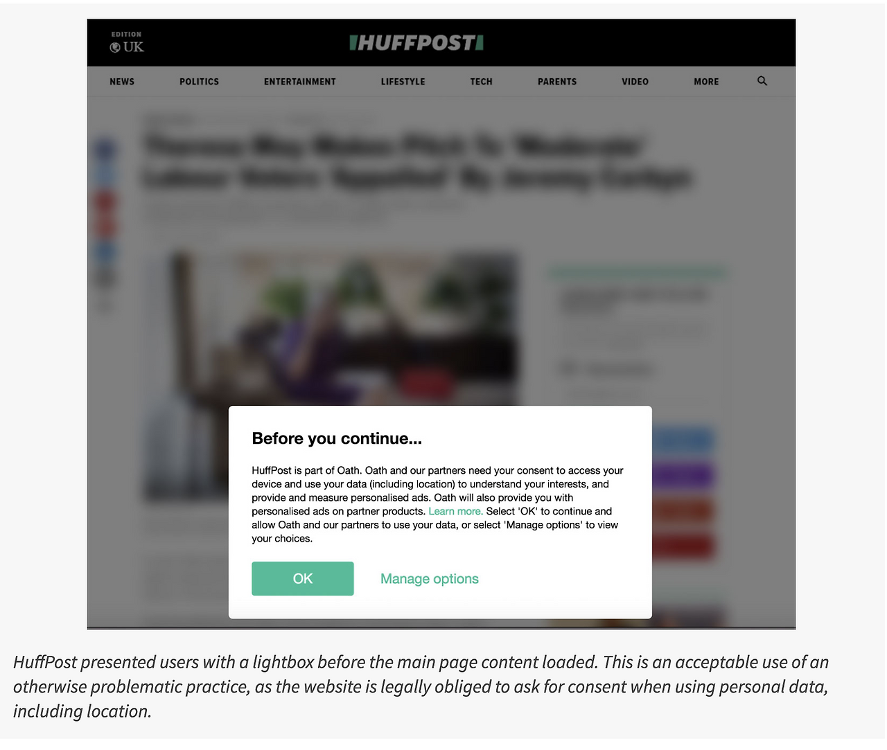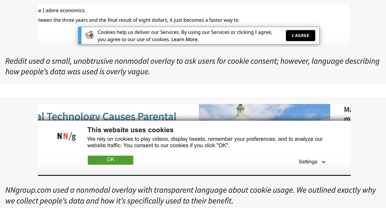 대신 해야 할 것 : 친절한 모달이 아닌 오버레이는 페이지 바닥 또는 옆에서 나타나는 오버레이이다. 이런 형태는 개입을 최소화하고 사용자가 그들이 하려는 작업을 이어서 할 수 있도록 허용한다. 사용자의 개인 데이터가 수집되고 사용되는 것에 대한 충분한 정보를 주도록 확실하게 한다.