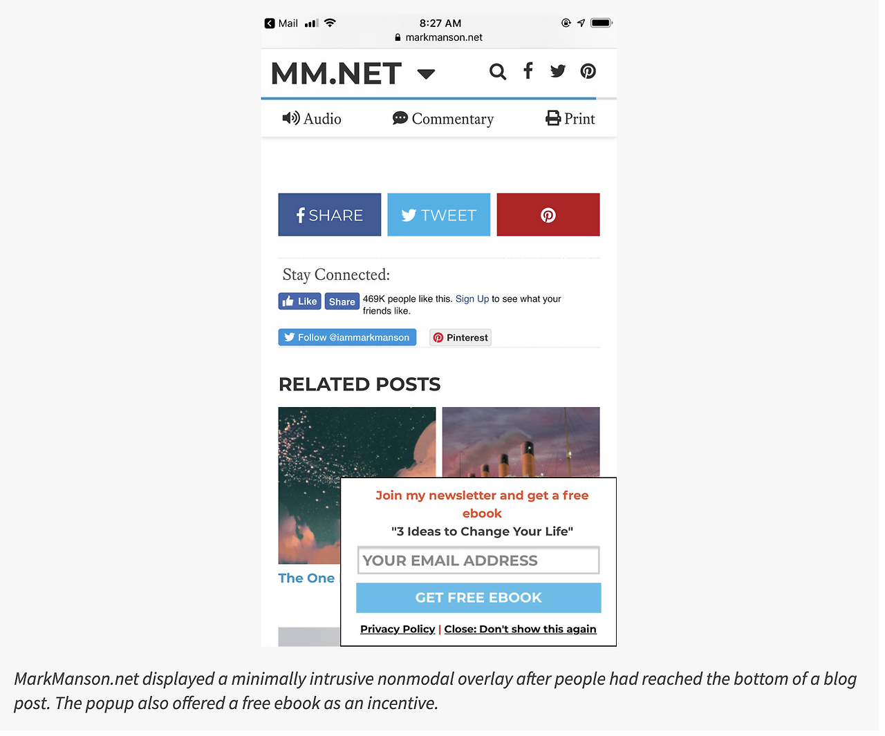 대신해야 할 것 : 이메일 팝업을 일찍 띄우는 대신에 언제 사용자가 편안하게 그들의 이메일을 공유하고 싶어 질지 고민해야 한다. 프로모션 코드를 받기 위해서 이메일 제공을 요청할 것인지 또는 모든 블로그 포스트를 읽거나 보고 났을 때 구독 이메일요청을 제공할 것인지 고민해야 한다.