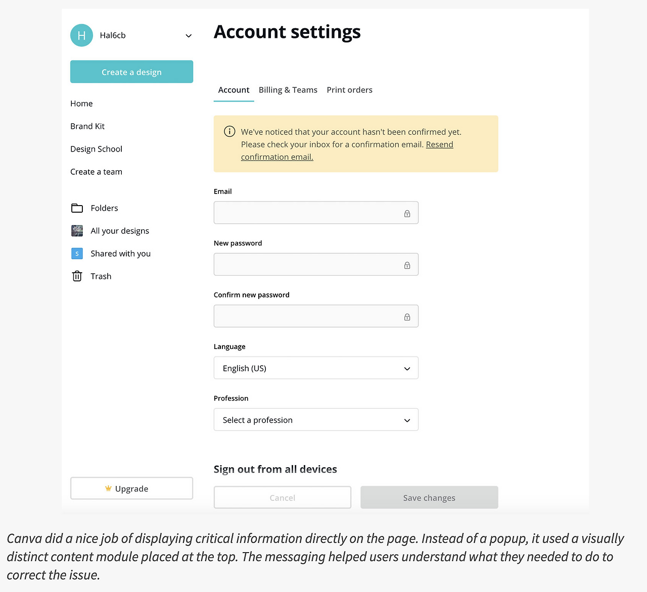 대신해야 할 것 : 만약 당신이 치명적인 정보를 반드시 팝업으로 보여줘야 한다면 한 번에 한 개만 보여주는 것으로 확실하게 디자인해야 한다. 치명적인 정보를 팝업에 보여주지 않는 것이 훨씬 나은 방법이다 사람들은 읽기도 전에 팝업을 꺼버리는 경향이 있기 때문이다. 대신, 페이지에 시각적으로 눈에 띄는 요소와 위치에 문맥적으로 가장 걸맞은 메시지를 직접적으로 보여주어라. 적히는 문구는 분명하게 사용자가 이슈를 바로 잡을 수 있고 다음단계로 갈 수 있는 분명하고 정확한 문구로 적혀야 한다.
