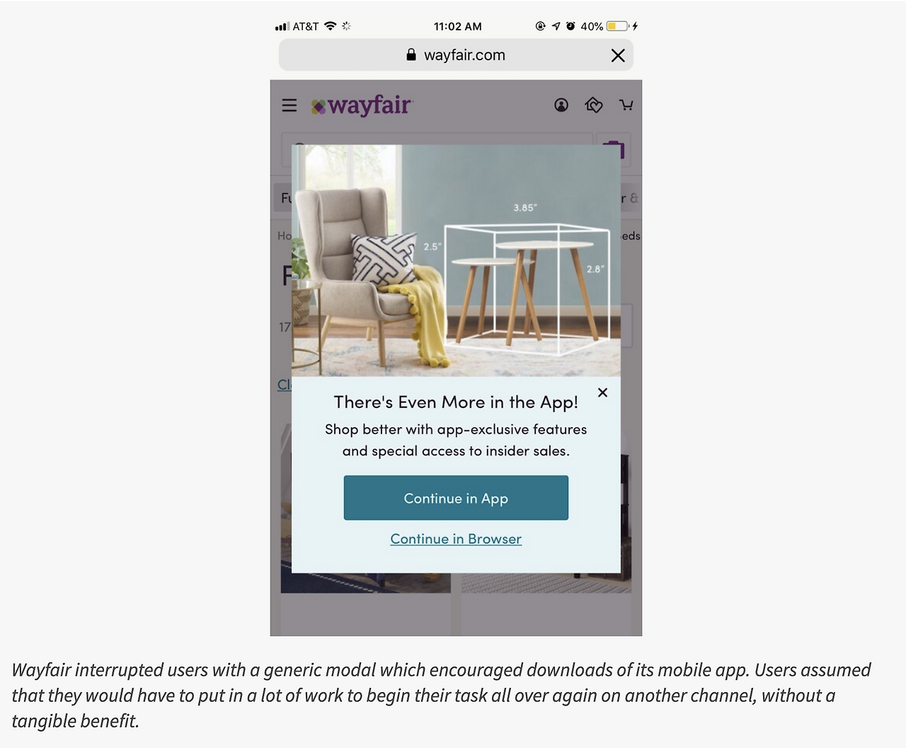 10.분명한 이점에 대한 내용 없이 모달오버레이로 접속하고 있는 채널을 변경하도록 독려하는것 : 모바일웹사이트에 접속했을때 모바일 앱에서 접속하도록 독려하는 모달오버레이를 띄우는 것은 평소에 자주 우리가 보게되는 것인데 특히 이커머스나 뉴스레터 웹사이트에서 많이 볼 수 있다. 이런 오버레이는 많은 상황에서 방해가되고 문제가 된다. 웹 사용자는 한번만 써보려고 접속한 사용자이기 때문에 앱까지 다운받을 의향이 없는 경우가 대부분이기 때문이다.