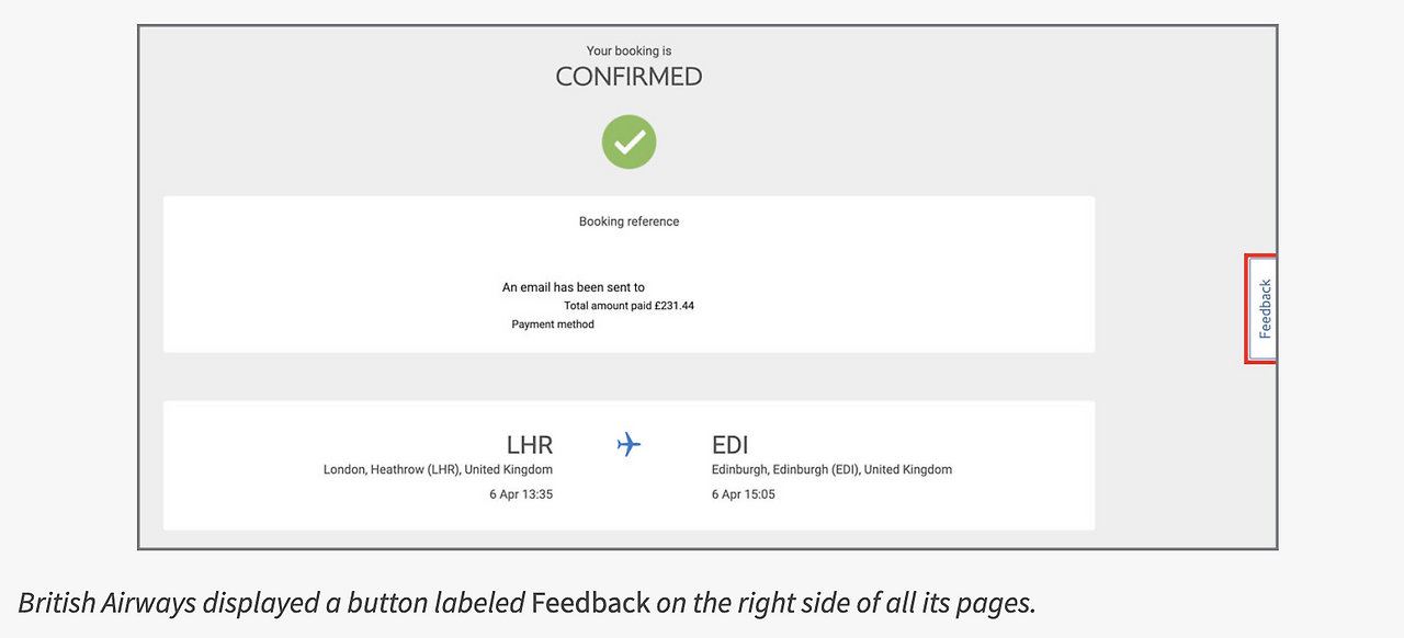 대신해야 할 것 : 중요한 작업이 완료된 후에만 사용자에게 피드백을 제공하도록 요청하는 것 외에도 사용자가 언제든지 피드백을 제공할 수 있는 정적이고 방해되지 않는 수단을 제공해야 한다. 스크린의 옆 사이드 탭, 푸터에 링크로 또는 내비게이션 안에 링크로 피드백을 전달할 수 있도록 만들어두면 사용자가 피드백을 공유하고 싶은 때가 되었을 때 공유할 수 있게 된다.