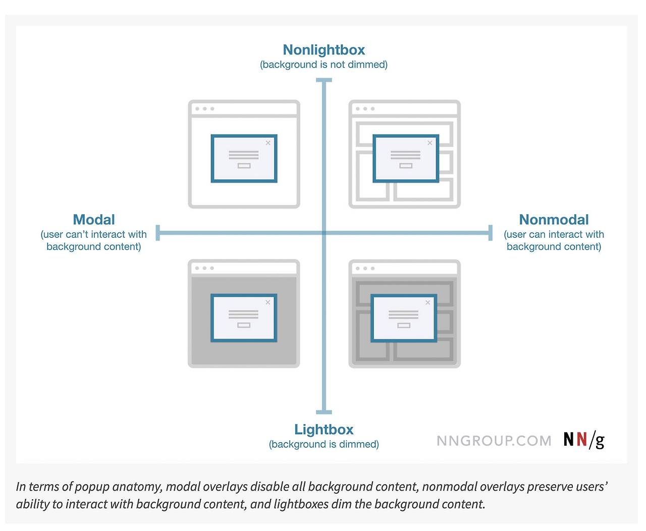 중요한 정보를 전달하기 위한 모드 오버레이의 사용을 적절한 시점에만 적용한다. 중요한 작업을 중단하거나 크고 거슬리는 팝업으로 관련 컨텐츠를 차단하지 않는다. 팝업이 사용자를 답답하게 만들지 않도록 사용성 테스트를 수행하여 전체 사용자 경험을 향상시키는데 도움이 되는 실제 통찰력을 얻을 수 있다.