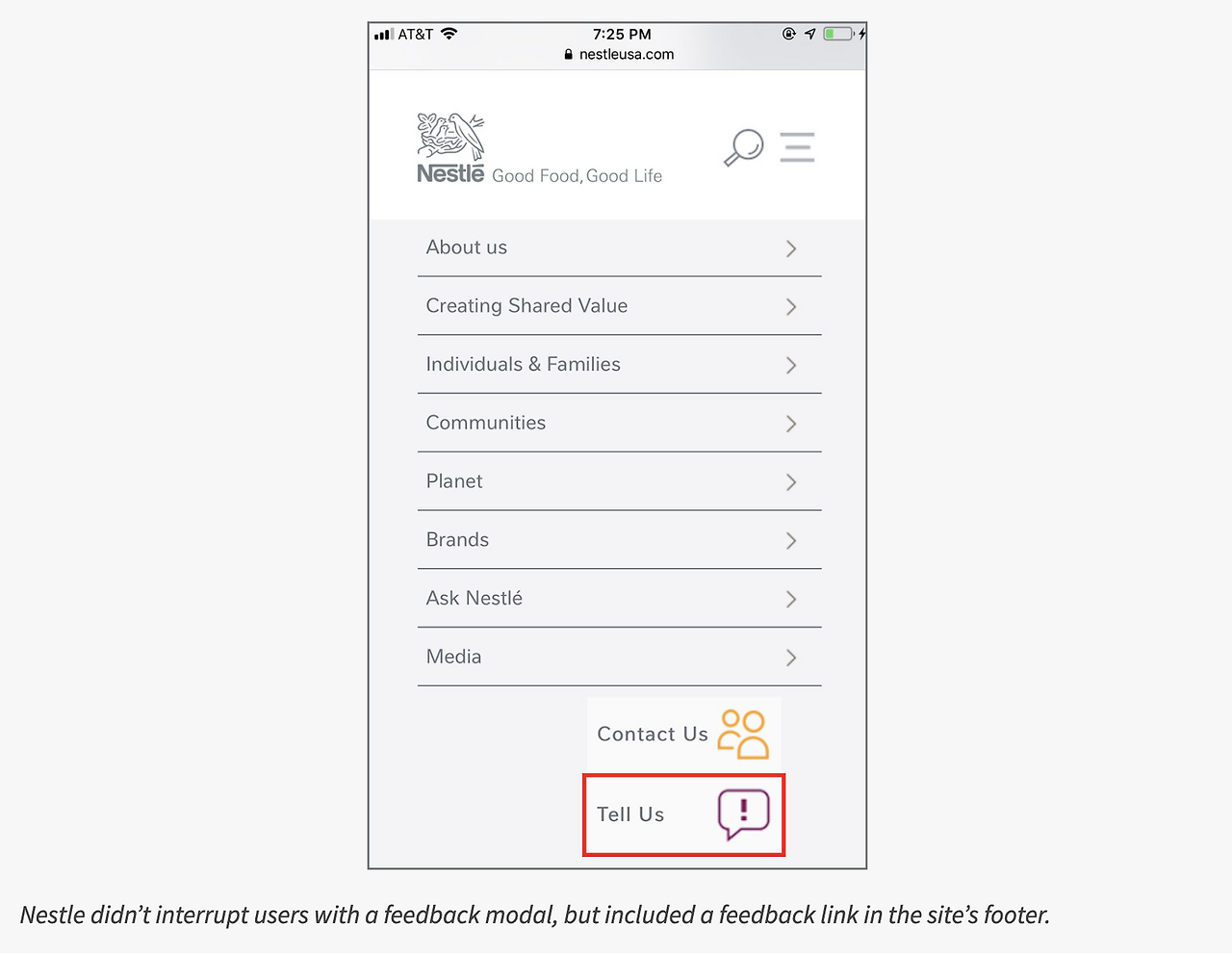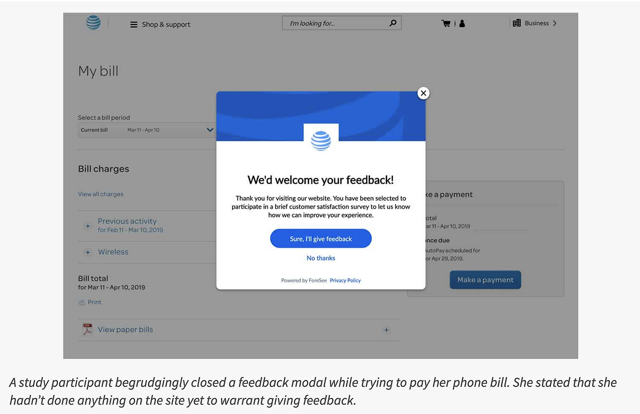 경험의 적절한 지점에서 사용자에게 의미 있는 피드백을 얻는 것은 그들의 어려움과 장애물에 대한 통찰력을 제공한다. 그러나 너무 빨리 피드백을 물어보면 가장 중요한 때에 피드백을 받지 못할 위험이 있다. 예를 들어 아래 ATT.com에서 전화 요금을 지불하려 하는 동안 한 연구 참가자는 이제 막 요금납입을 하려는 페이지에 랜딩 하자마자 피드백 팝업을 만나게 되어 답답했다. 그녀는 "글쎄... 나는 요금을 납부하고 나서 피드백을 주려고 했다 하지만 나는 아무것도 하지 않은 상태에서 피드백을 달라는 팝업을 보게 되고 황당했다"말했다