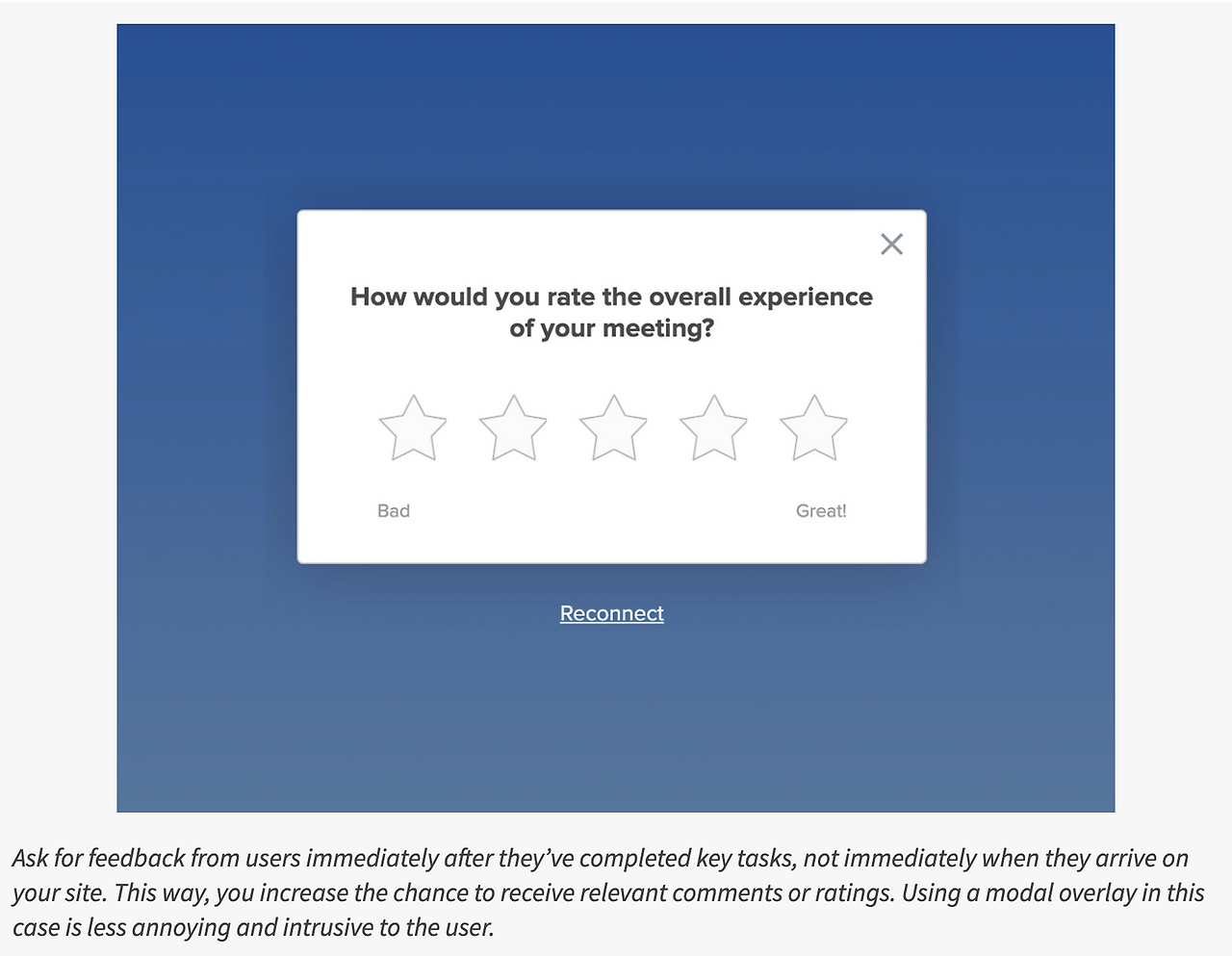 대신해야 할 것 : 사용자가 당신의 사이트에서 중요한 작업을 완료했을 때 즉시 피드백을 물어봐라. 이런 접근은 방해를 최소화하고 피드백이 실제 상호작용 경험에 바탕한 것임을 분명히 한다. 예를 들어 블루진이라는 비디오 컨퍼런싱 소프트웨어에서는 사용자에게 미팅이 끝났을 때 피드백을 바로 물어본다. 이런 요청은 너무 이른 시점에 묻는 것도 아니고 맥락적으로 연관성이 있고 적절한 시점에 묻는 것이다.