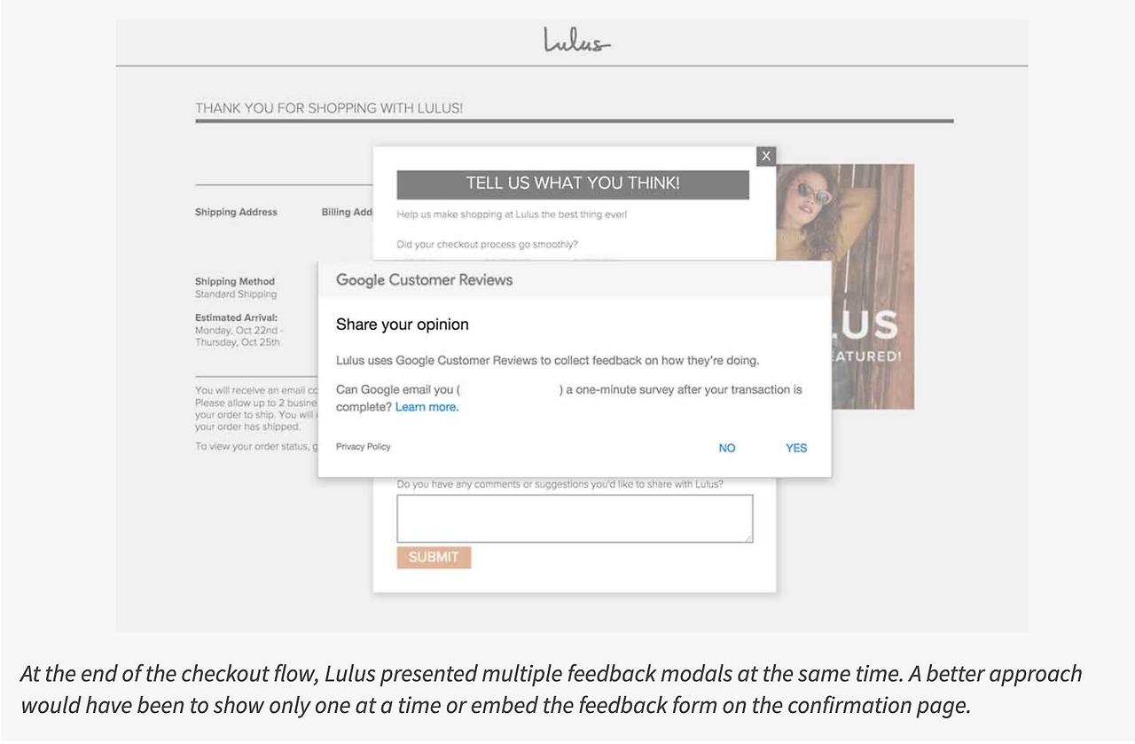 4. 사용자들이 의미 있는 어떤 작업이든 마무리하기 전에 피드백을 물어보는 것 : 당신의 사용자들로부터 피드백을 받는 것은 중요하다 하지만 사람들이 당신의 웹사이트에서 의미 있는 작업을 끝내기도 전에 피드백 창을 자주 보여주는 것은 하면 안 된다. 사이트와 앱은 사용자가 높은 피드백 점수를 주고 작업을 진행하기를 바라는 경향이 있다. 하지만 이런 일은 거의 일어나지 않는다. 사용자를 오히려 팝업을 다시 찾을 의도 없이 빠르게 닫으려고 한다.