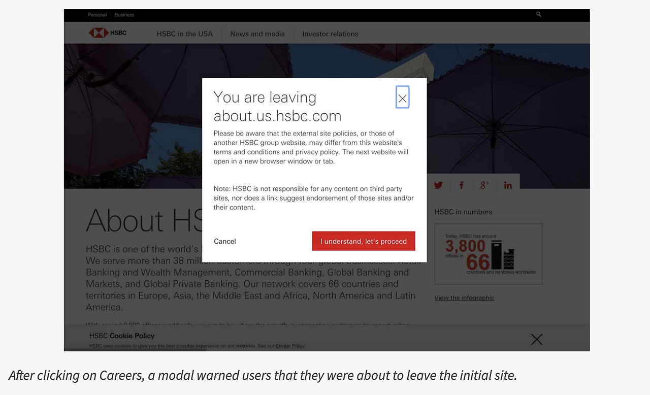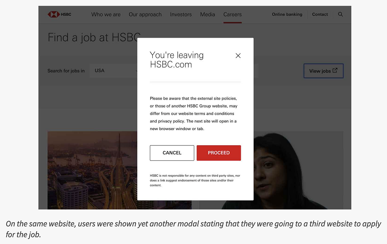 우리의 사용성 테스트 중 한 개의 세션에서 HSBC의 일자리를 찾아보는 참가자 한 명이 3개의 다른 사이트를 번갈아가며 사용해야만 했을 때 두 개의 다른 전환 모달을 접하게 되었다. 그는 "와우 이 사이트는 나를 계속 다른 사이트로 이동시킨다. 나는 내가 지금 어디 있는지 더 이상 모르겠다. 만약 그들의 직무지원 절차가 이처럼 복잡하고 분절되어 있었다면 나는 솔직히 내가 좋은 곳에서 일할 수 있을 것이라고 생각하지 않는다. 이런 경험은 아무리 사이트 디자인이 좋아 보여도 너무 정신없다. "말했다.