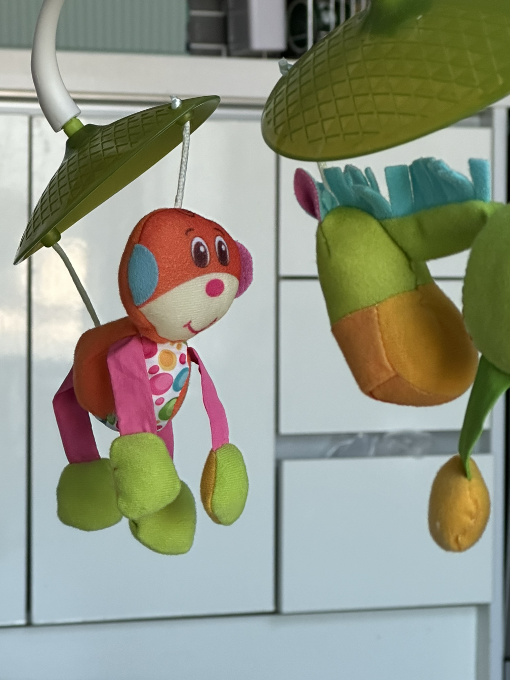 모빌 모는 시간이 점점 길어진다. 혼자 모빌을 보면서 옹알이를 하는데 인형들과 대화를 하는 모습처럼 보인다.
