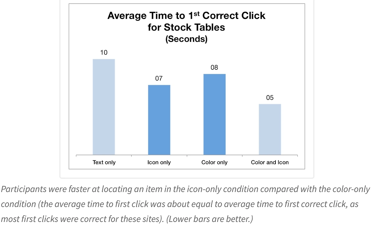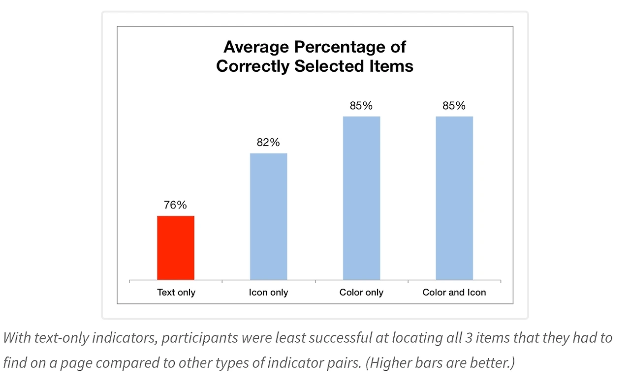 웹페이지의 리스트에서 색상과 아이콘이 함께 사용된 시각적 표시(visual indicator) 가 있는 경우, 텍스트만 있는 경우보다 사용자가 항목을 찾는 속도가 약 37% 더 빠르다.