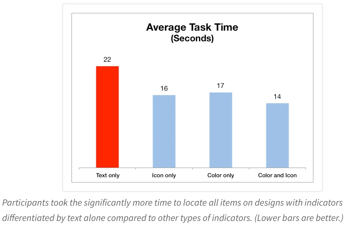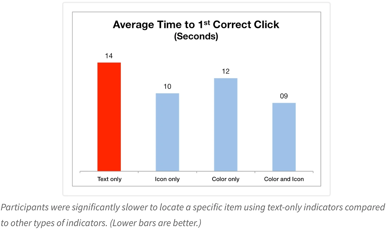 모든 측정 변수에서, 텍스트만 사용한 경우보다 비(非)텍스트 기반 시각적 표시(색상, 아이콘 등)를 사용한 경우가 더 좋은 성과를 보였다.