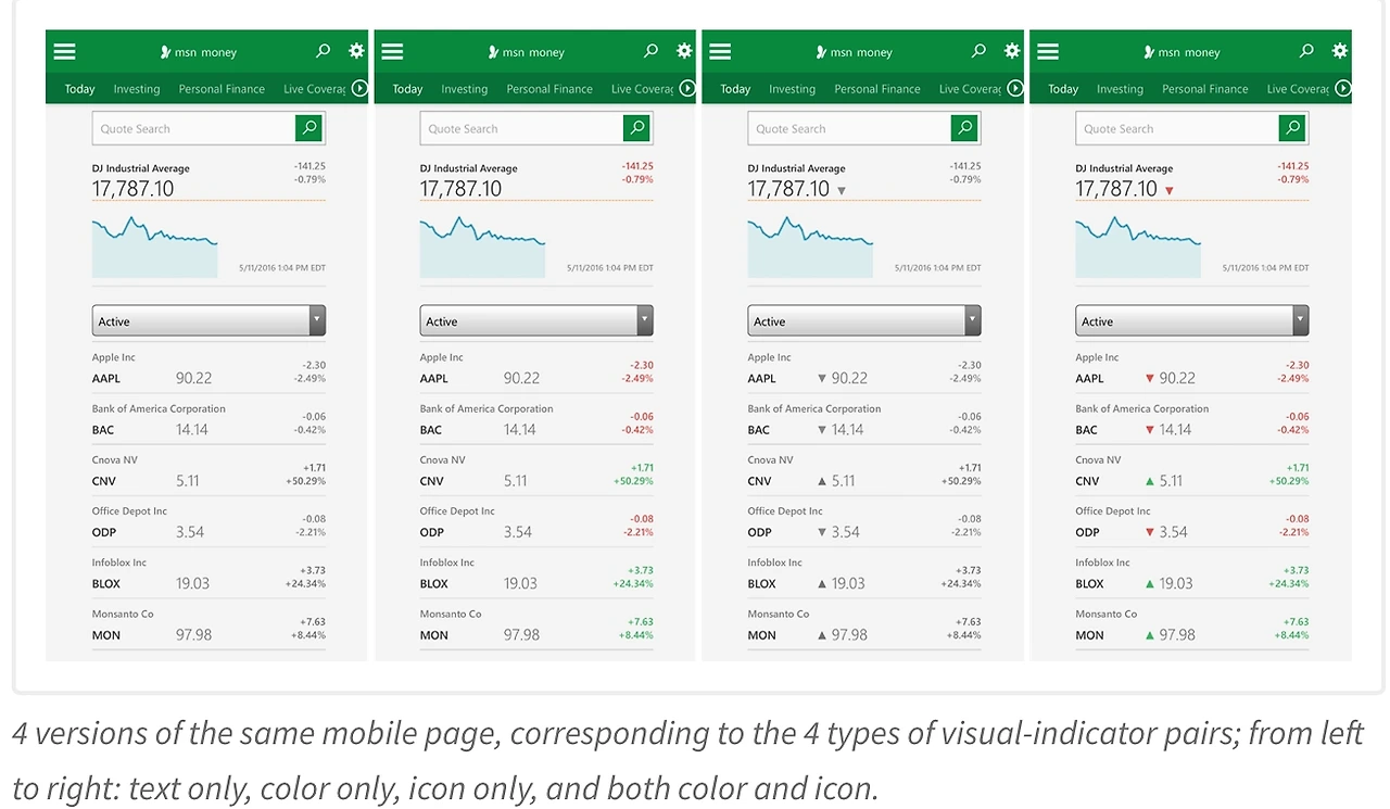 테스트 결과, 모바일 화면에서 색상과 아이콘이 모두 다른 시각적 표시를 사용할 때,