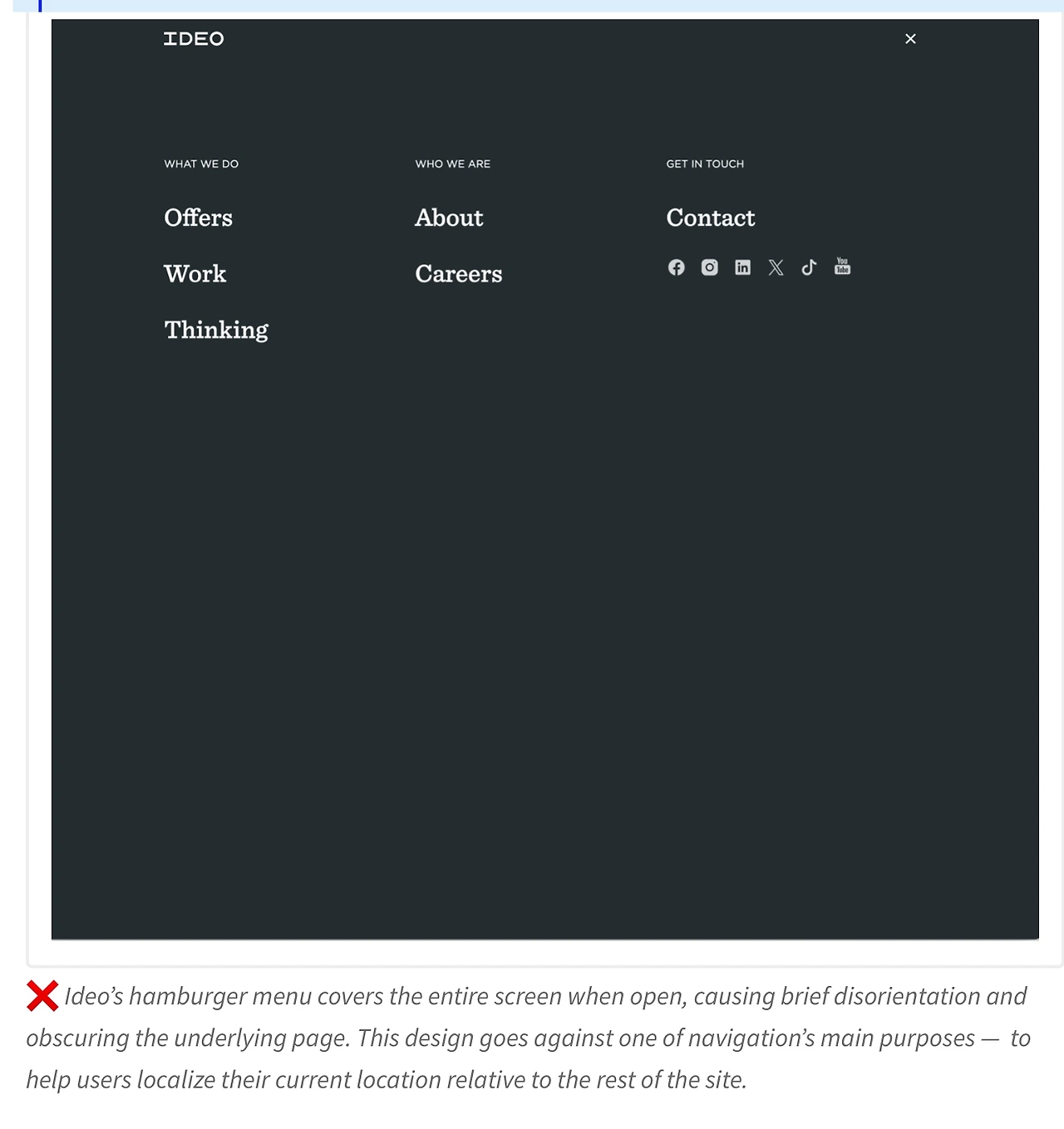 일부 사용자는 메뉴가 열렸을 뿐인데 새 페이지로 이동했다고 착각하며 일시적으로 방향 감각을 잃을 수 있다. 또 어떤 사용자는 사이트 구조에서 현재 자신의 위치를 파악하기 더 어려워질 수 있다.