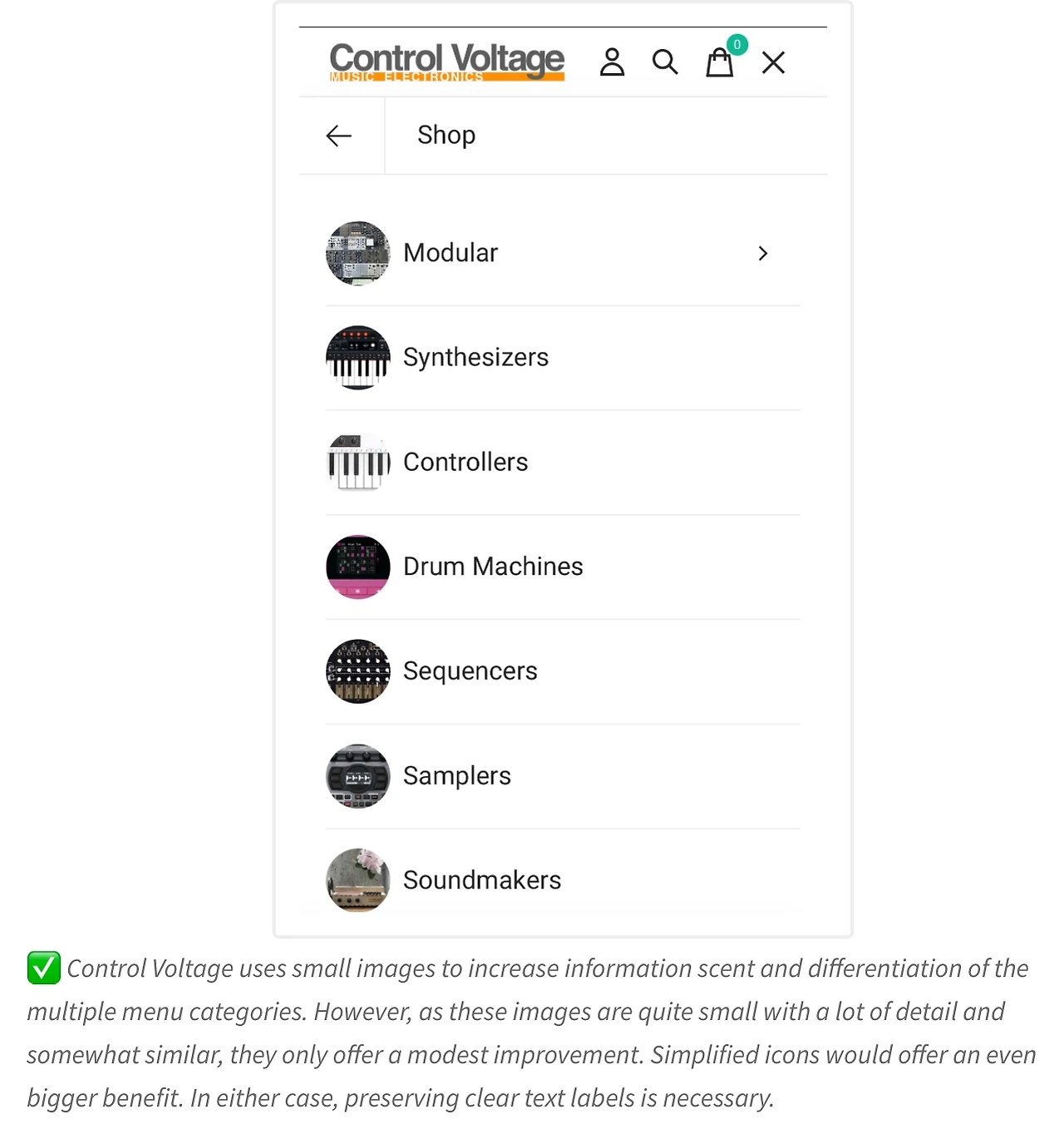 긴 메뉴에서는 시각적 요소를 활용해 **정보 냄새(information scent)**를 강화할 수 있다(선택적이고 추가적인 신호로서). 이미지, 아이콘, 제한적인 색상 사용은 익숙하지 않은 옵션의 이해(또는 구분)에 도움이 되고, 스캔하기도 쉬워진다.