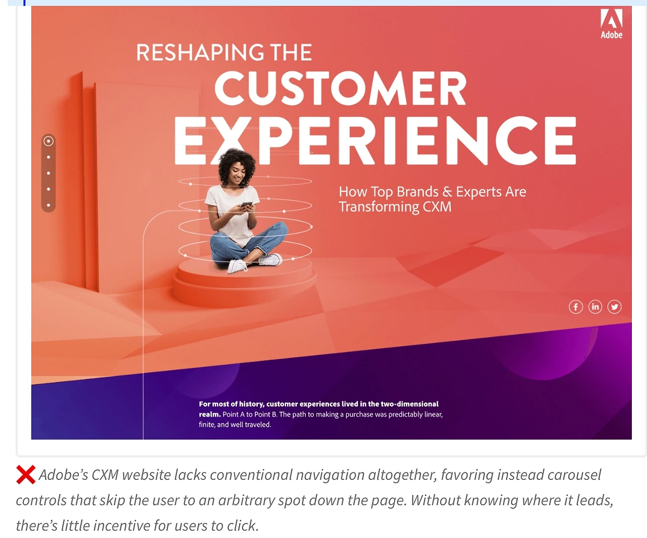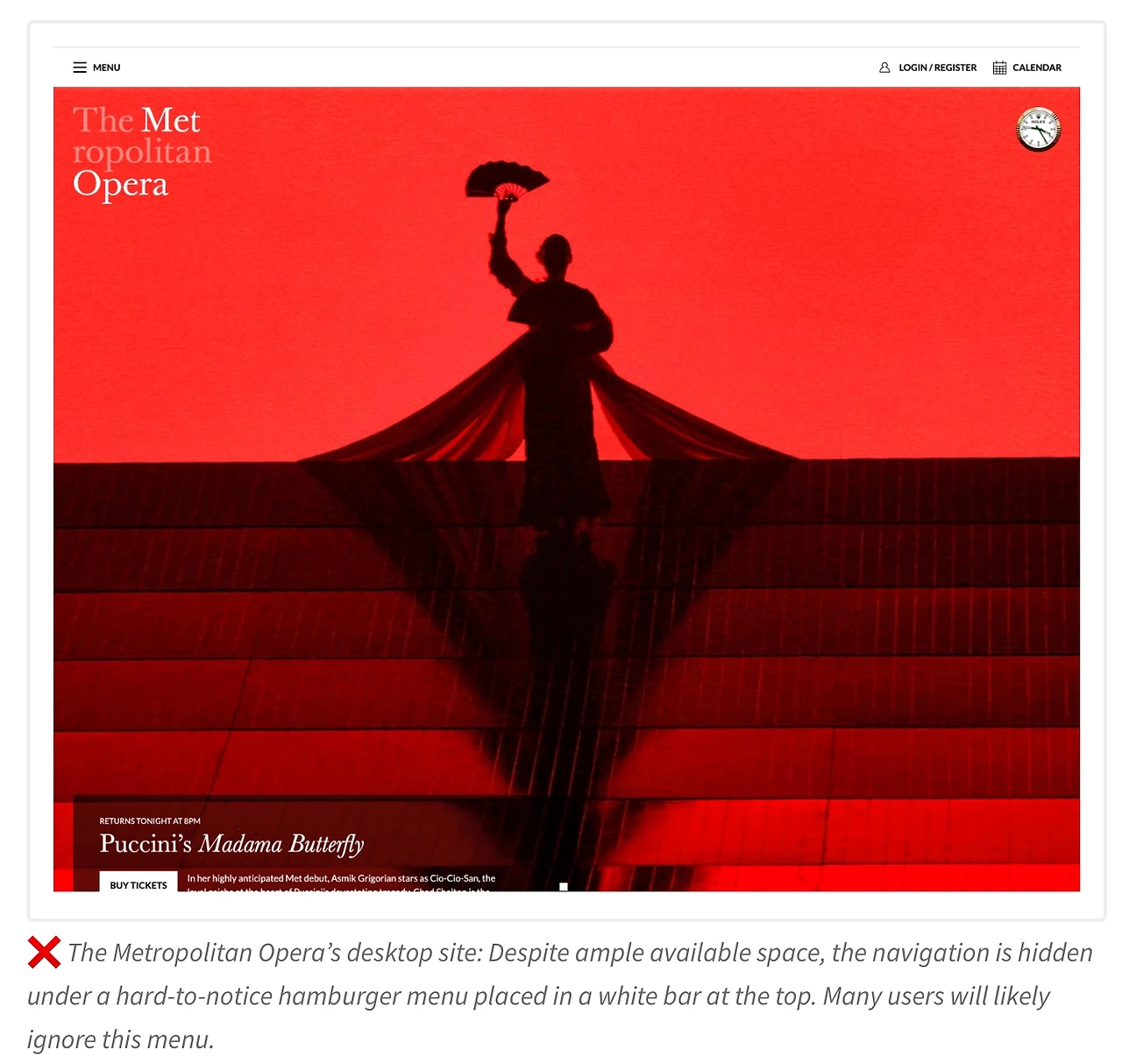 사용자에게 멋진 효과로 감동을 주려는 시도는 메뉴를 만들 때 우선순위가 되어서는 안 된다. 클라이언트나 이해관계자가 새로운 메뉴 디자인에 잠시 감탄할 수 있지만, 사용자는 익숙한 메뉴를 통해 매력적으로 제공되는 훌륭한 콘텐츠에 훨씬 더 큰 만족을 느낀다.