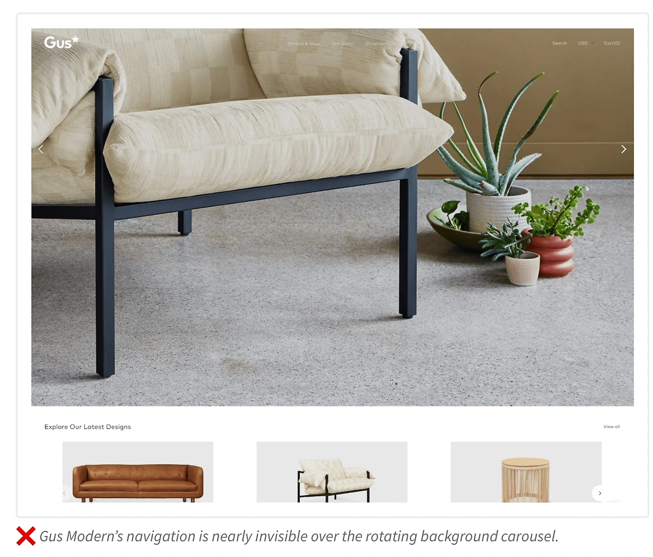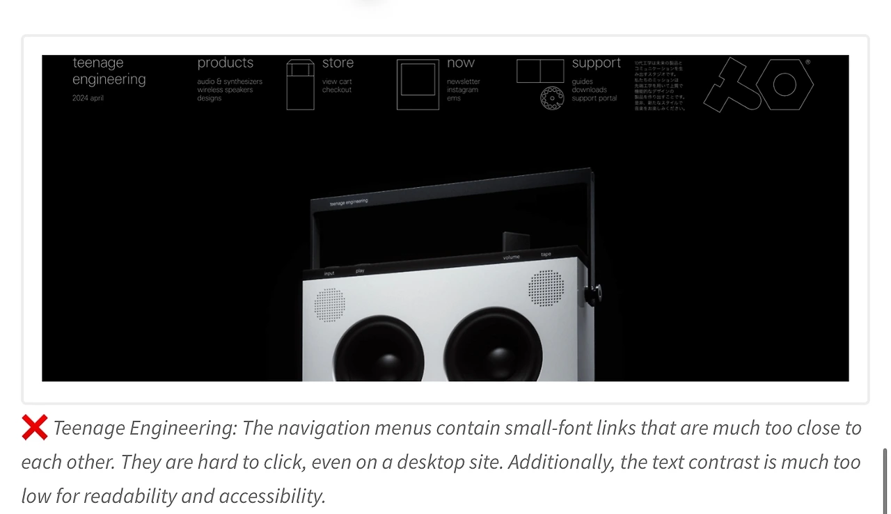 디자이너들이 대비 지침을 무시하는 경우가 놀라울 만큼 많다. 디지털 공간에서의 탐색은 원래도 충분히 혼란스러운데, 메뉴를 읽기 위해 화면을 찡그리며 봐야 한다면 더욱 어려워진다.