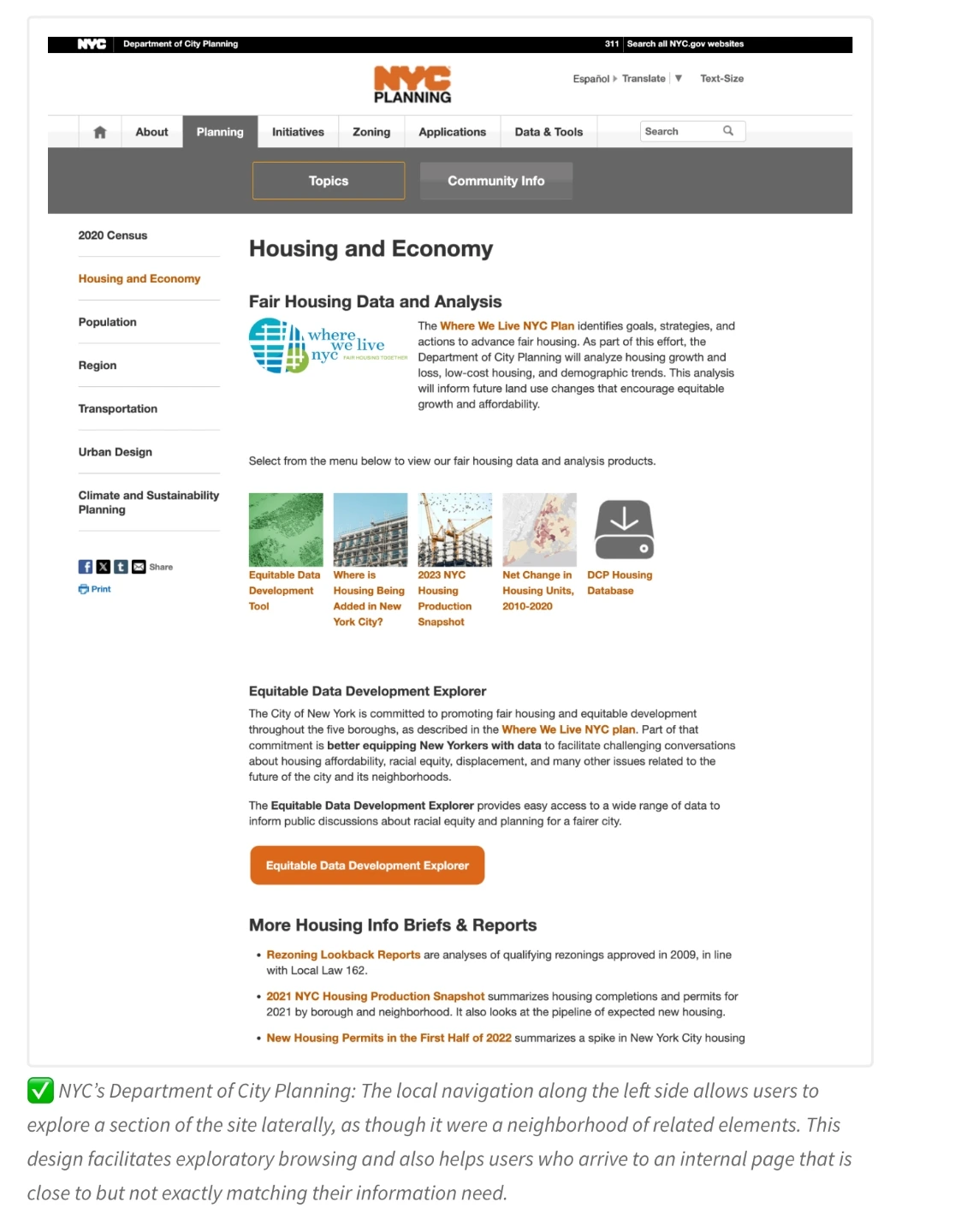 사용자가 관련 제품을 비교하거나 한 섹션 내에서 여러 작업을 수행해야 하는 경우가 많다면, 계층 구조를 오르락내리락하는 ‘포고스틱’ 방식으로 이동하도록 강요하지 말고 해당 가까운 페이지들을 로컬 내비게이션 메뉴를 통해 바로 보이게 해야 한다.