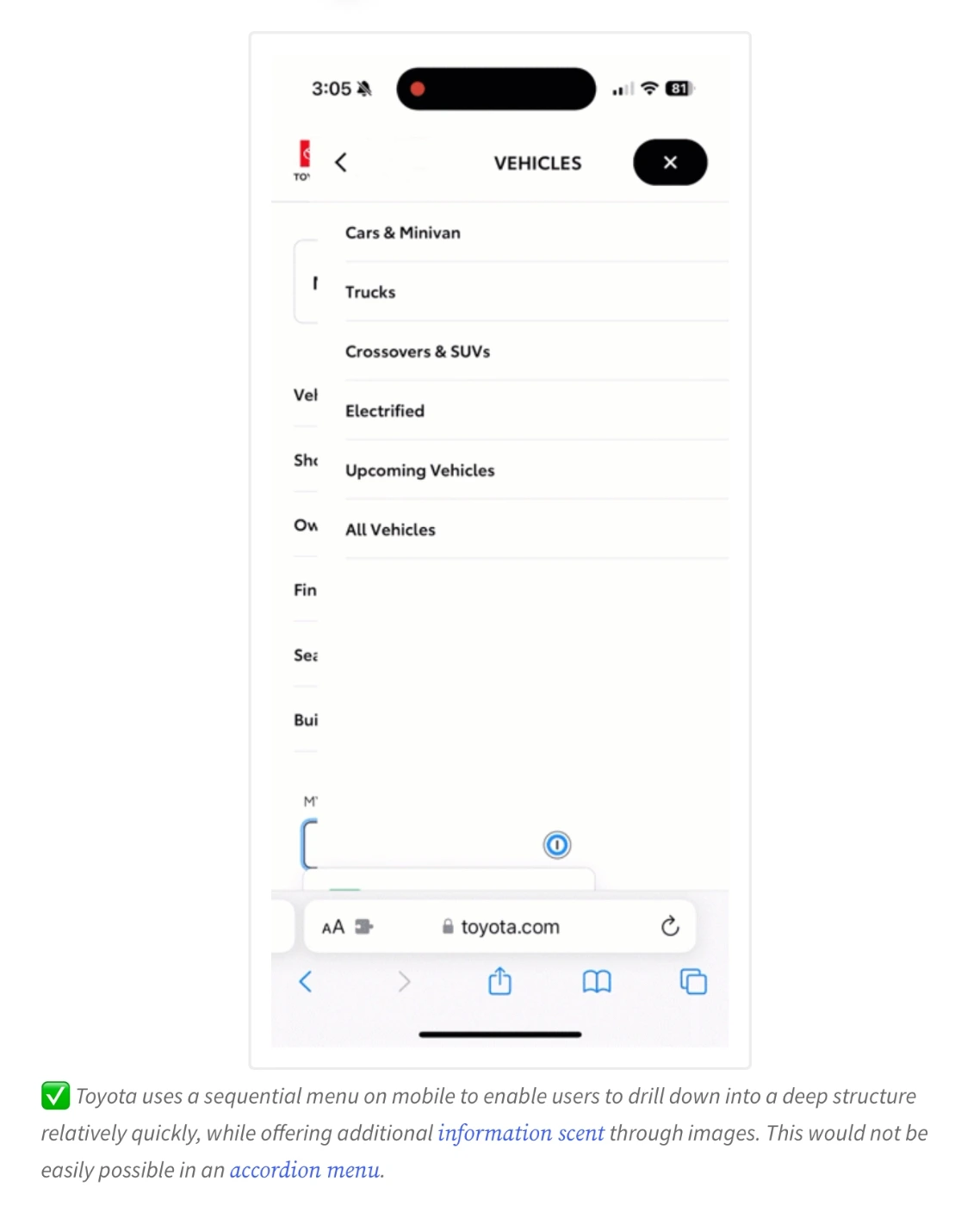 사용자 여정이 여러 단계의 구조를 내려가며 탐색하는 과정을 포함한다면, 메가메뉴가 한두 단계를 건너뛰도록 도와 시간을 절약할 수 있다. 모바일에서는 순차적 내비게이션을 통해 깊은 구조도 자연스럽게 탐색할 수 있다.