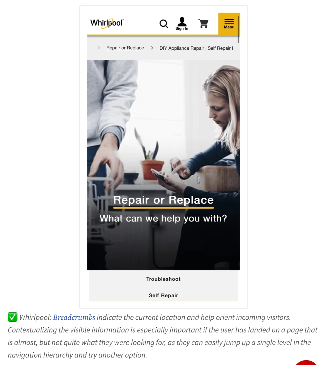 내비게이션 메뉴가 수행해야 할 가장 중요한 역할 중 하나는 사용자가 현재 위치를 파악하도록 돕는 것이다. 방문자는 종종 홈페이지가 아닌 다른 페이지에서 사이트에 진입하기 때문이다.