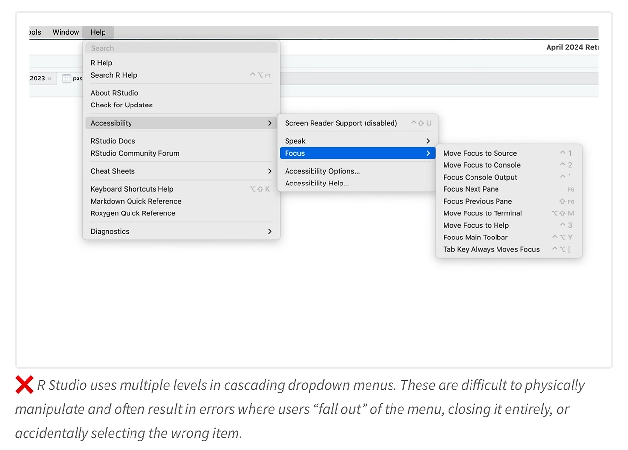 호버 기능은 모든 환경에서 지원되지 않는다. 터치스크린 사용자나 주로 키보드로 상호작용하는 사용자는 호버로 숨겨진 콘텐츠에 접근할 수 없다. 메뉴가 호버로 열리도록 설정되어 있다면, 이러한 사용자에게 접근할 수 있는 대체 방법을 제공해야 한다.
