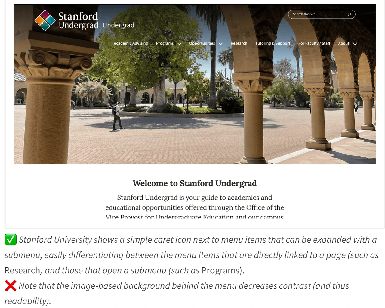 이 표시기는 직접 새 페이지로 이동하는 주요 내비게이션 항목과 서브메뉴로 확장되는 항목을 구분하는 데 도움을 준다. 만약 카테고리 이름이 클릭(또는 탭) 가능한 것처럼 보이지 않으면, 사용자는 서브메뉴가 있다는 사실조차 알아차리지 못할 수 있다.