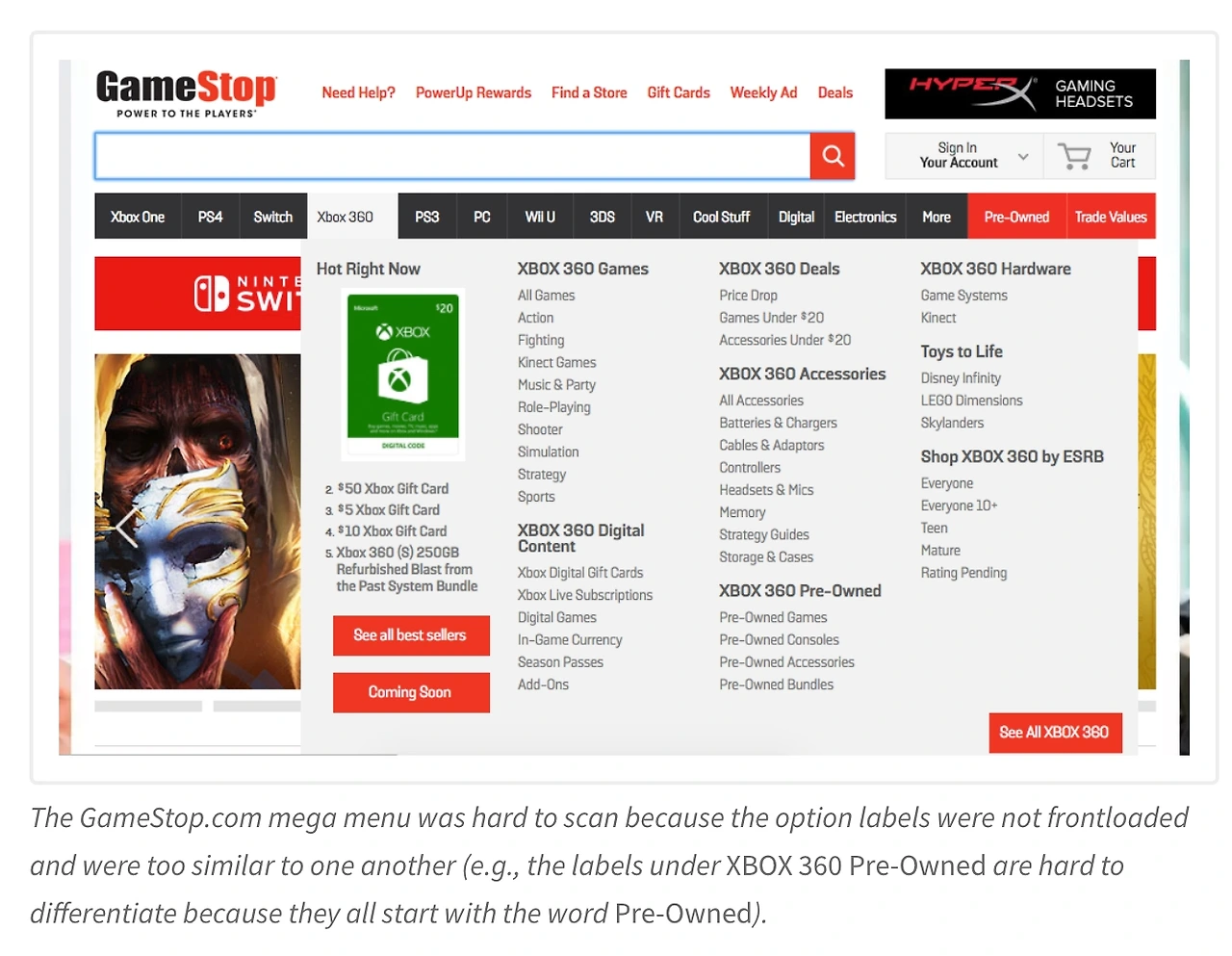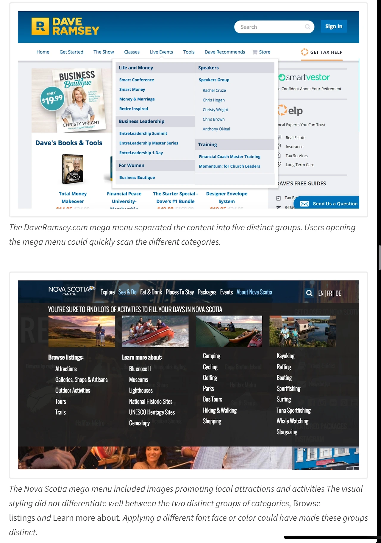 또한 메가메뉴는 디자이너가 사이트 정보 구조의 여러 단계를 보여줄 수 있게 해준다. 위 다섯 가지 예시 중 세 가지(Dave Ramsey, Game Stop, John Lewis)에서는 메가메뉴에 1단계 카테고리와 2단계 카테고리가 모두 포함되어 있다.