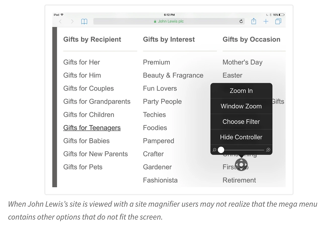 예를 들어, 위 JohnLewis.com 스크린샷에서 **화면 확대기(screen magnifier)**를 사용할 경우, 첫 번째 그룹은 보이지만 Gift Food & Alcohol 항목이나 그 오른쪽 그룹들은 보이지 않는다. 전체 메뉴 오른쪽 가장자리에 있는 그림자(drop shadow)는 너무 미묘하여 대부분의 사용자, 특히 시력이 좋지 않은 사용자에게는 도움이 되지 않는다. 사용자는 보이는 내용이 전체 콘텐츠라고 잘못 생각할 수 있으며, 따라서 저시력 고객이 많은 사이트(특히 연령층이 높은 사용자를 타깃으로 하는 경우)에서는 주문을 잃을 수도 있다. 메뉴 경계에 강력한 시각적 신호를 제공하는 것이 이 문제를 완화하는 한 방법이다.