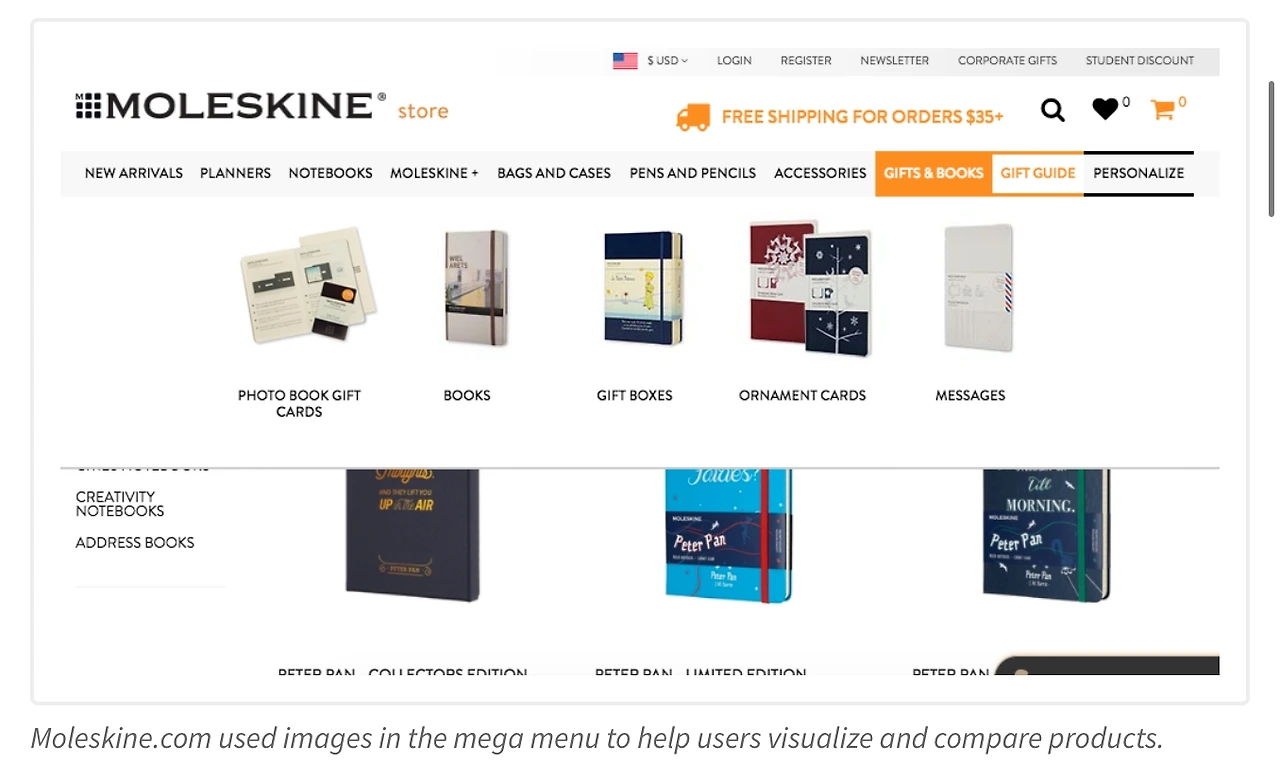 • 텍스트만으로도 충분할 수 있지만, 이미지나 아이콘은 많은 정보를 쉽게 전달할 수 있다(Moleskine 예시 참조). 메가메뉴는 필요에 따라 이미지를 쉽게 사용할 수 있게 해준다. 텍스트만 사용하더라도, 중요한 링크와 덜 중요한 링크를 구분할 수 있는 풍부한 타이포그래피를 활용할 수 있다.