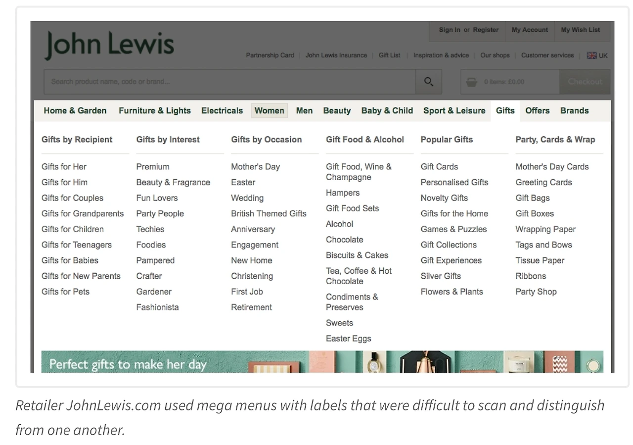 • 라벨 간 구분 명확히 하기 (예: JohnLewis.com의 Gift by Interest와 Gift by Occasion는 구분이 어려움)