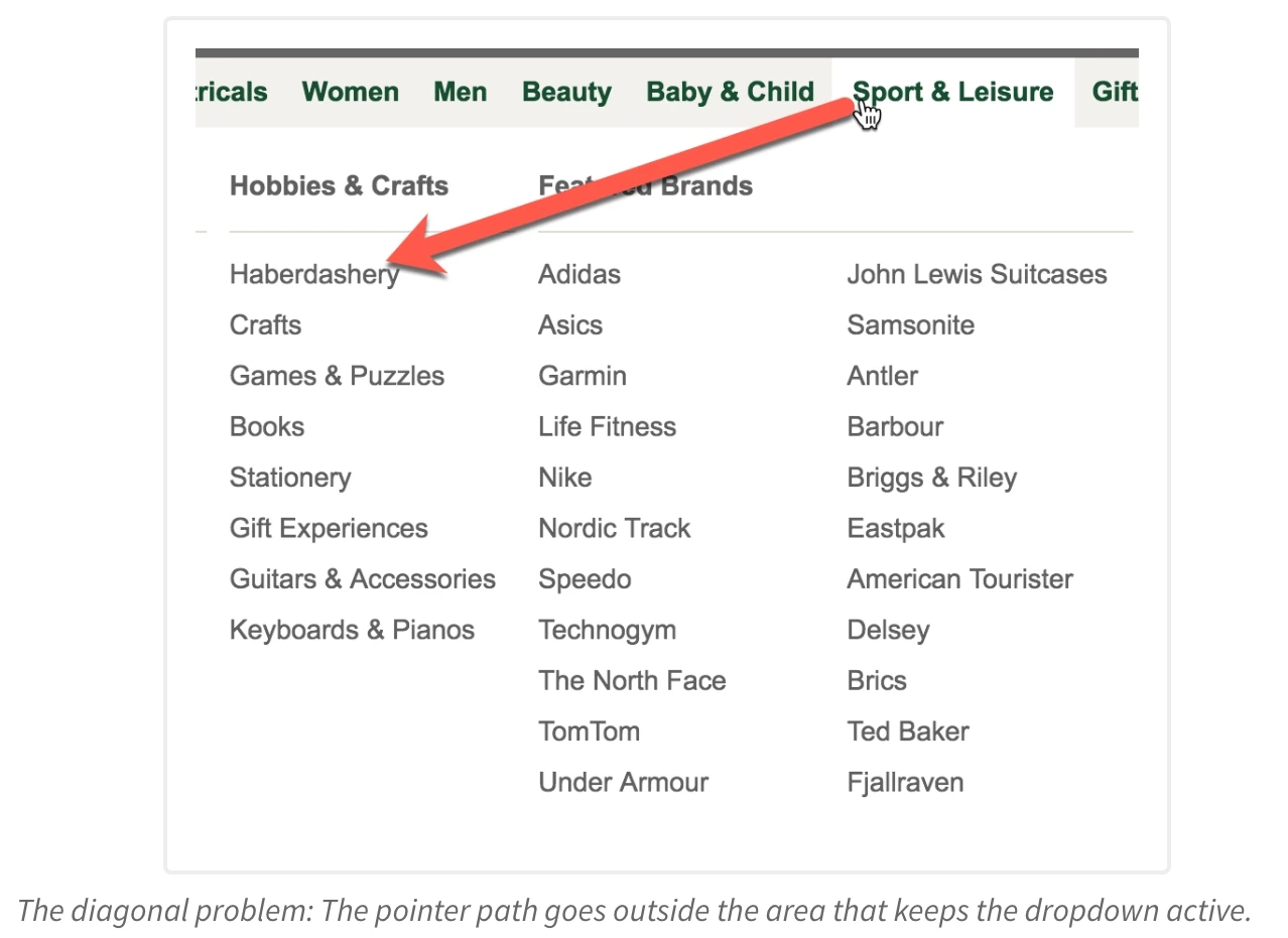 위 예시에서 사용자는 먼저 Sport & Leisure 네비게이션 항목을 가리킨 후 Haberdashery를 선택하려 한다. 이 두 지점 사이를 이동하는 과정에서 포인터가 Baby & Child 항목을 지나치게 된다. 많은 사용자는 포인터를 매우 빠르게 이동하기 때문에 활성 영역을 0.5초 미만으로 벗어나지만, 느리게 움직이는 사용자나 연령대가 높은 사용자는 메뉴 항목을 가리키는 도중 드롭다운이 사라져 매우 불편함을 느낄 수 있다.