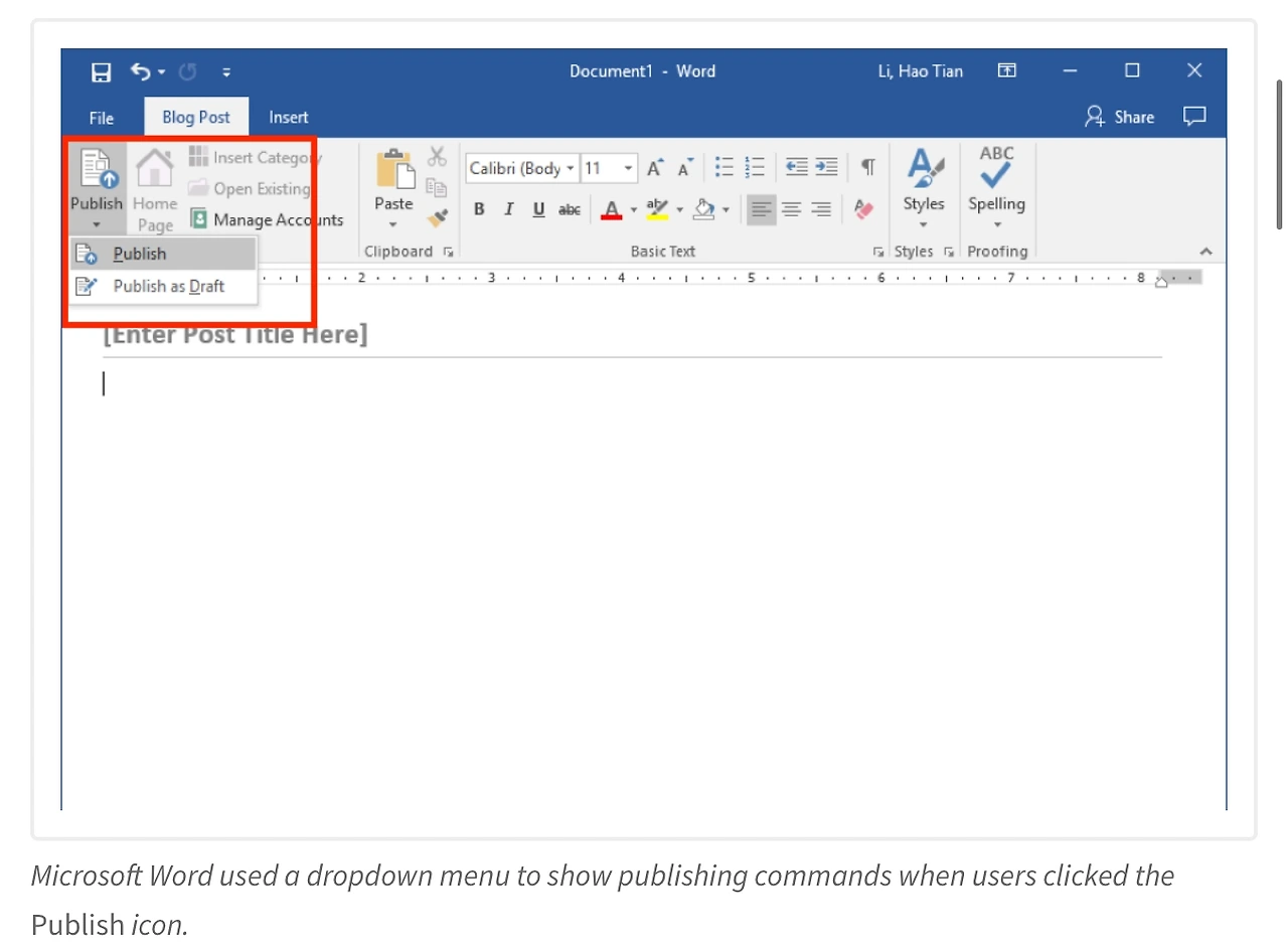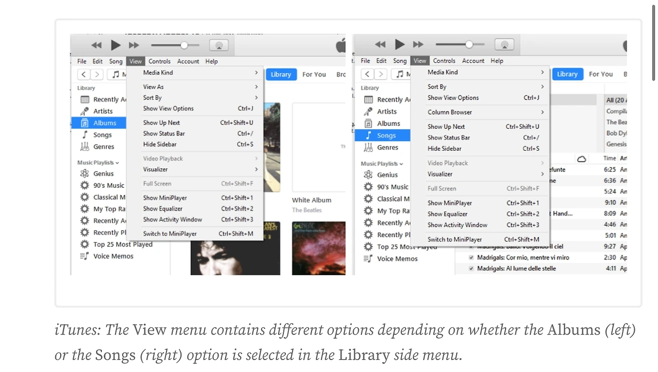 MacOS와 Windows는 드롭다운 구현 방식이 다르지만, 두 경우 모두 **명령 메뉴(command menus)**와 **속성 선택 메뉴(attribute-selection menus)**는 다르다. 실제로 Macintosh Human Interface Guidelines는 명령을 위해 드롭다운 메뉴를 사용하지 말 것을 명시적으로 권장한다.