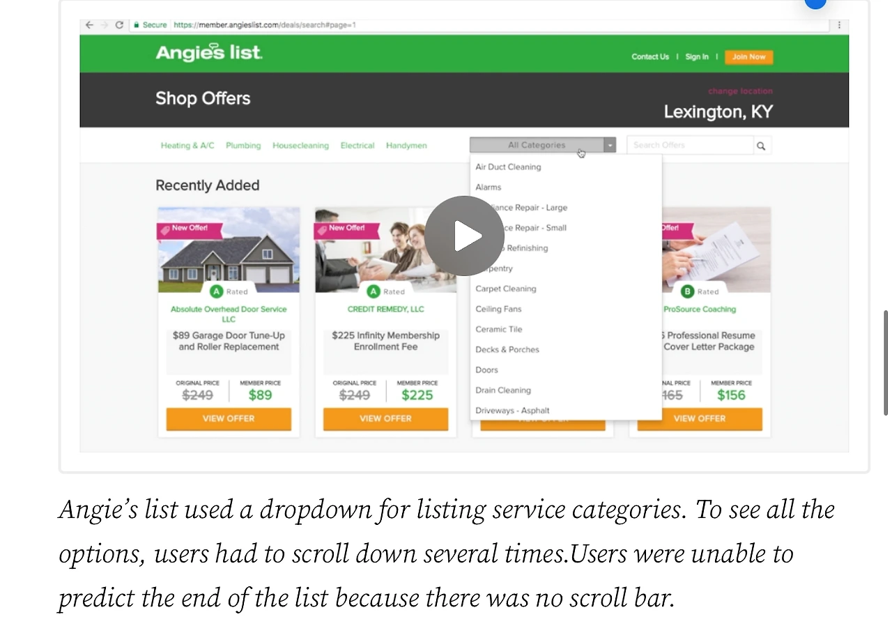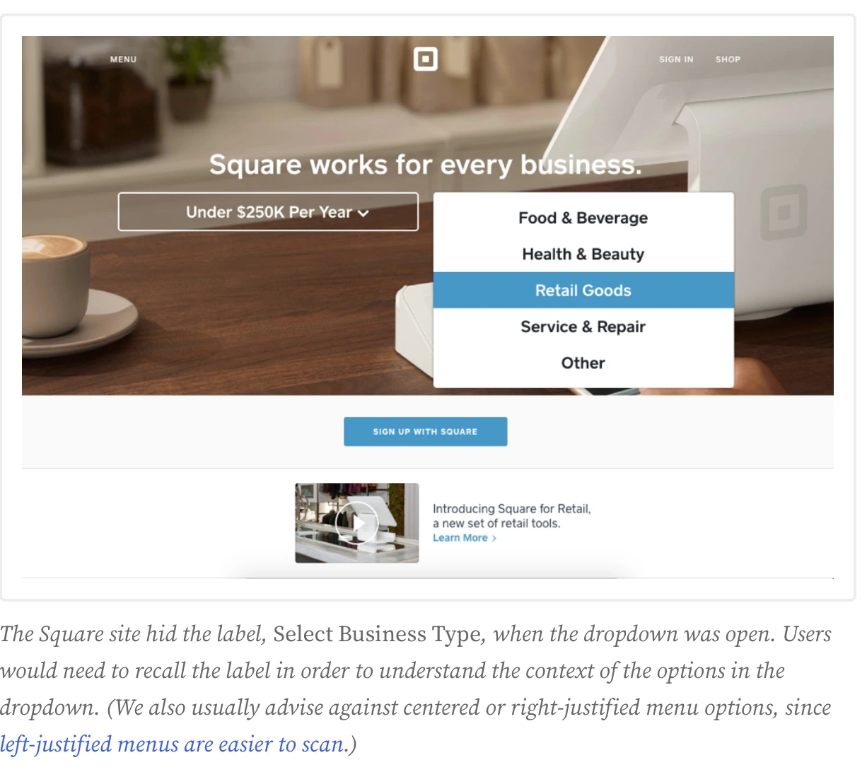 드롭다운은 효과적인 웹 디자인에서 분명히 필요한 요소이다. 하지만 과도하게 사용하거나 잘못 사용하면 많은 사용성 문제와 혼란을 초래한다. 디자이너들은 드롭다운을 다양한 목적으로 사용하며, 그 중 하나는:
