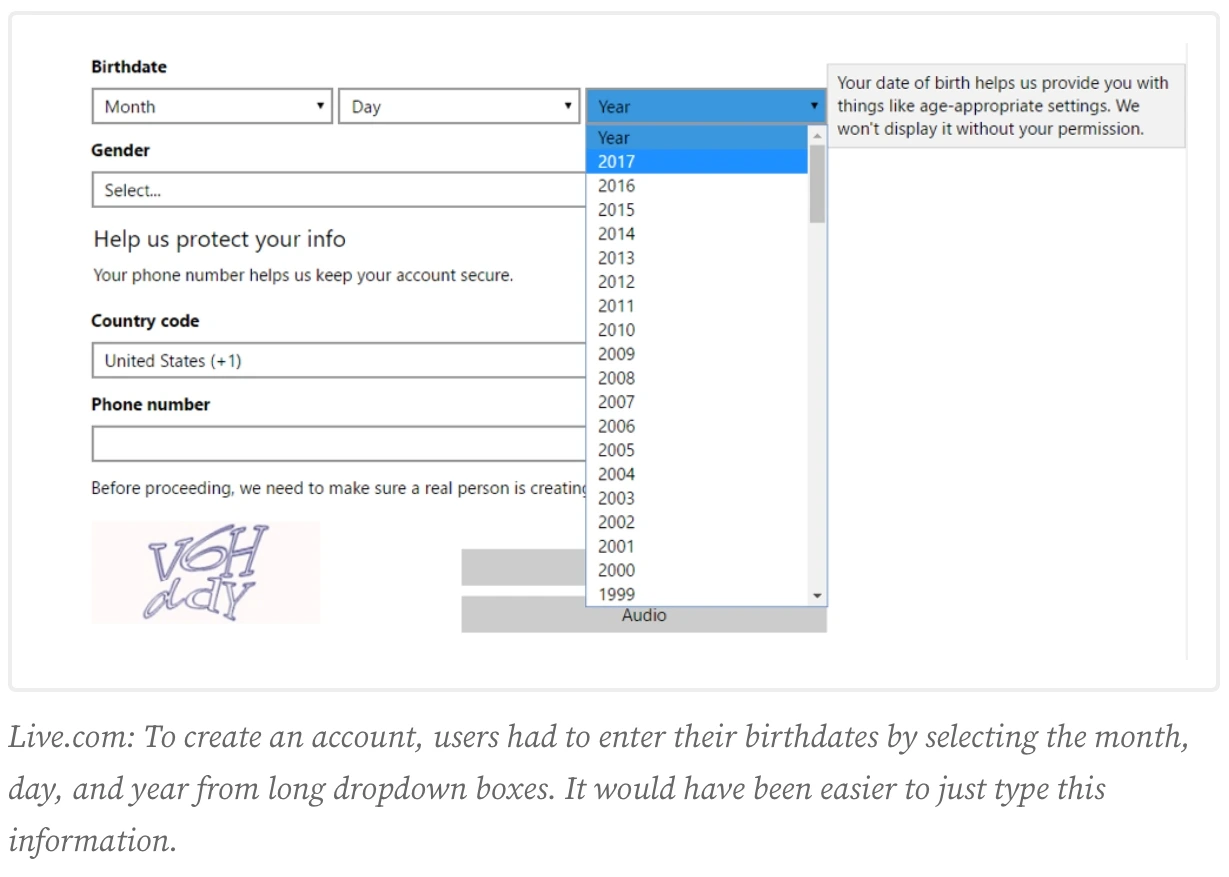 5. 사용자에게 매우 익숙한 데이터에는 드롭다운 박스를 피한다. 예를 들어 생년월일의 일, 월, 연도가 해당된다. 이러한 정보는 사용자의 손에 거의 자동으로 입력되는 경우가 많으며, 긴 메뉴에서 해당 옵션을 찾아야 하는 것은 번거롭고 이전 지침을 위반하며, 사용자의 부담을 더 늘릴 수 있다.