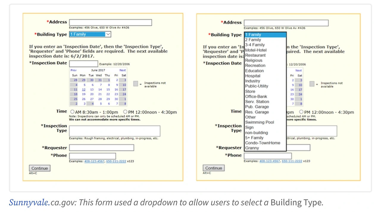 전형적인 사례로는 미국 우편 주소를 위한 주(state)나 국가(country) 목록이 있다. 사용자가 스크롤하는 드롭다운에서 주를 선택하는 것보다, 예를 들어 “NY”라고 직접 입력하는 것이 훨씬 빠르다.