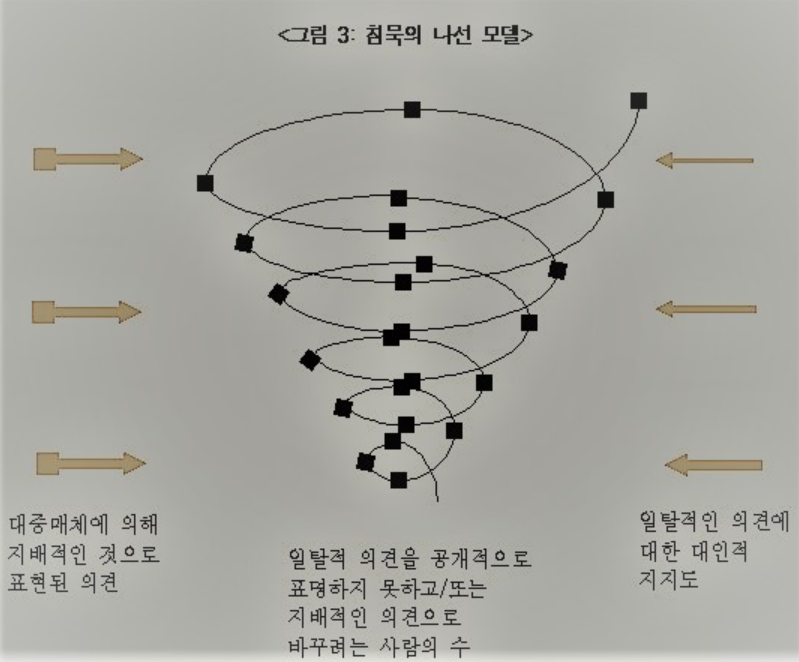 그러나 지금은 정당 활동이나 공식 라인을 통해 정치사회적 메세지를 보내지 않고도 기존 언론사들을 배척하고 자기들이 직접 언론을 자처하며 목소릴 낸다. 그리고 환상의 콜라보인게 커뮤니케이션학에서 등장하는 "침묵의 나선이론". 본래대로라면 다수의 여론이 소수의 여론을 잠재우는 양상을 나타내지만, 어떤 집단이 실제로는 다수파인데 소수파가 하도 시끄럽게 굴어서 스스로를 소수라고 착각하고 침묵을 지키는 경우라면 그 반대의 경우가 작동하게 된다. 이런 자극적인 정보들이 끊임없이 새어나온다면 결과는 어떨지 굳이 설명 안해도 아실 것이다.