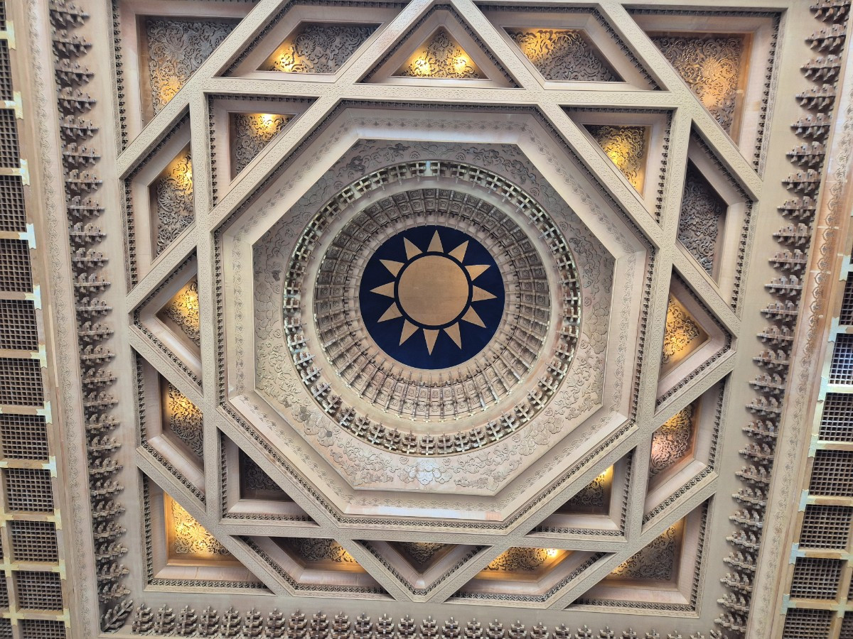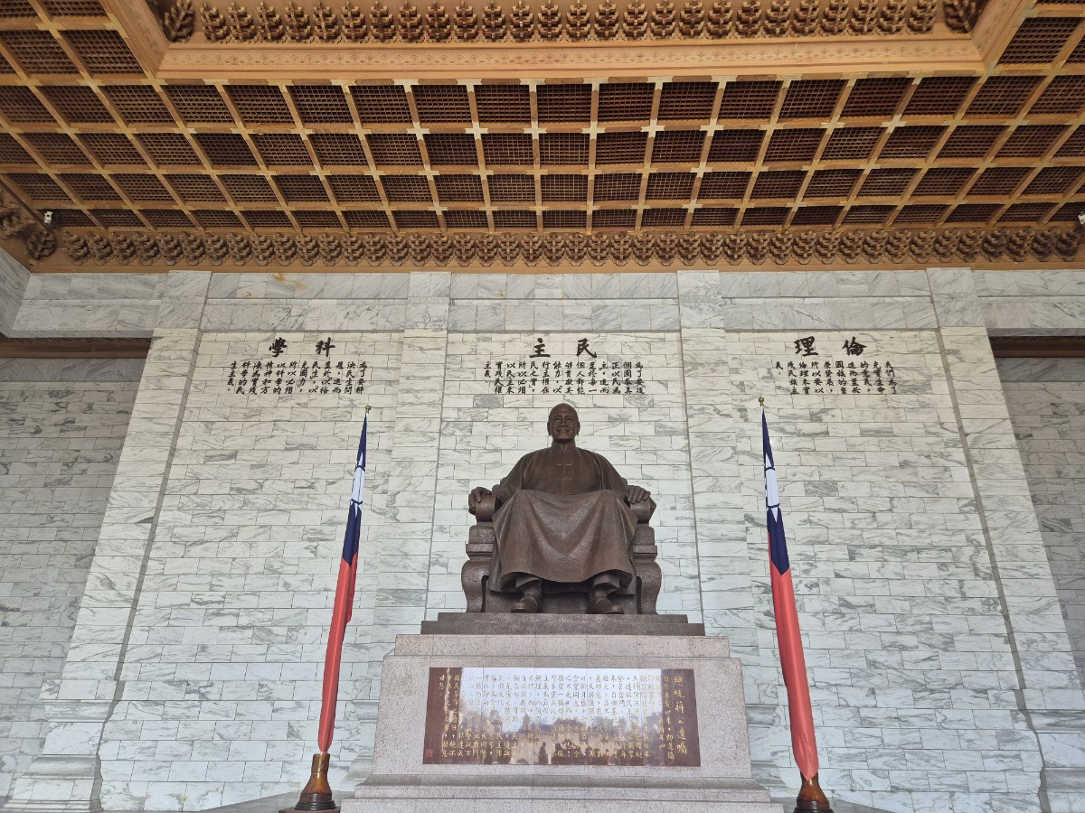 그의 거대한 청동상. 다른 사람들이 청동상 앞에 사진 찍기를 선호하며 앞에만 보고 있었지만 나름 역사덕후(?)라는 자부심과 함께 나는 천장을 바라보았다. 왜냐하면 미국 국회의사당 천장에 워싱턴 신격화 그림이 있듯 꼭대기 돔 모양이라 혹시나 하고 위를 올려다보니 왠걸, 중화민국 대만의 거대한 태양이 높게 떠 그려져 있었다. 벽면에 적혀있듯 민주를 생각했으나 정작 행동은 아들까지 세습하여 38년간 계엄령을 했던 장제스를 보면서 많은 생각들이 떠올랐다.