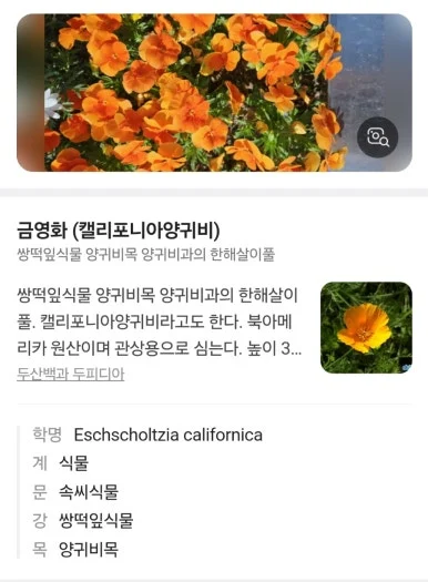 주홍 꽃을 스마트 렌즈로 촬영하니, '금영화'래.