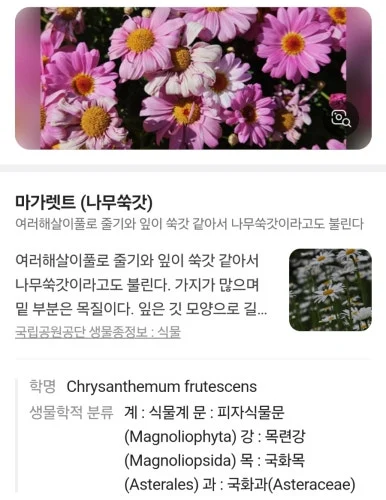 분홍 꽃도 마가렛트, 나무 쑥갓이네.