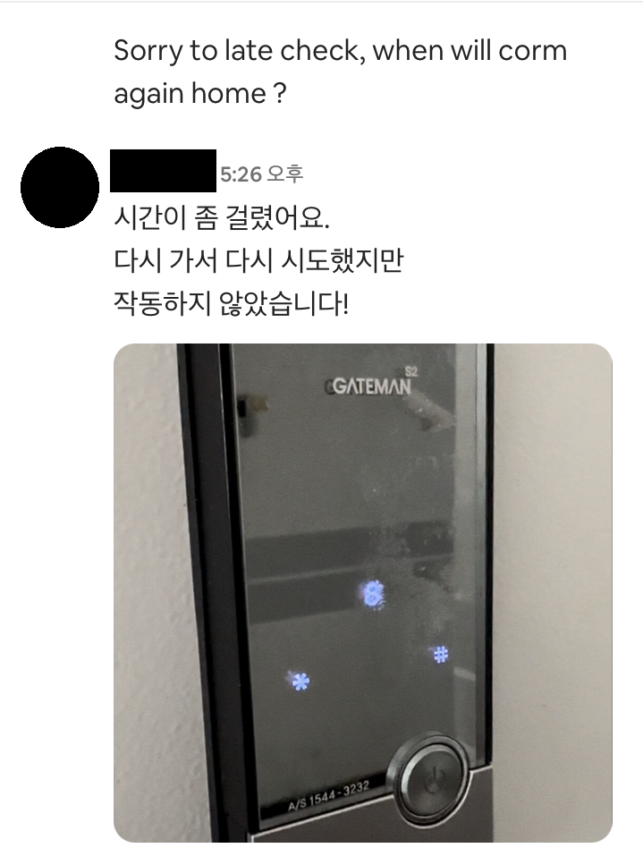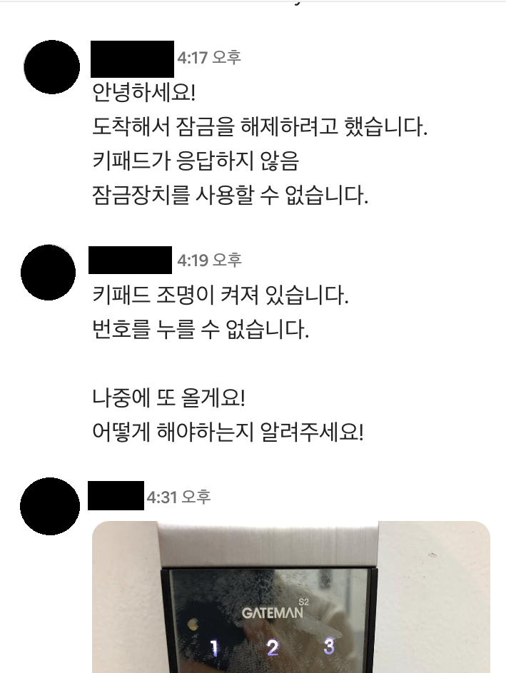 게스트는 키패드 사진을 올리면서 ‘작동이 되지 않아요. 언제 돌아오시나요?‘라는 메시지를 계속 보내왔다. 사진 속에는 내가 알려준 비밀번호가 아닌 다 다른 번호가 찍혀 있었다. 그리고 연이어 '키패드 불이 켜졌다가 다시 꺼졌어요. 다시 켜려면 어떻게 해야 하죠.'를 물었다.