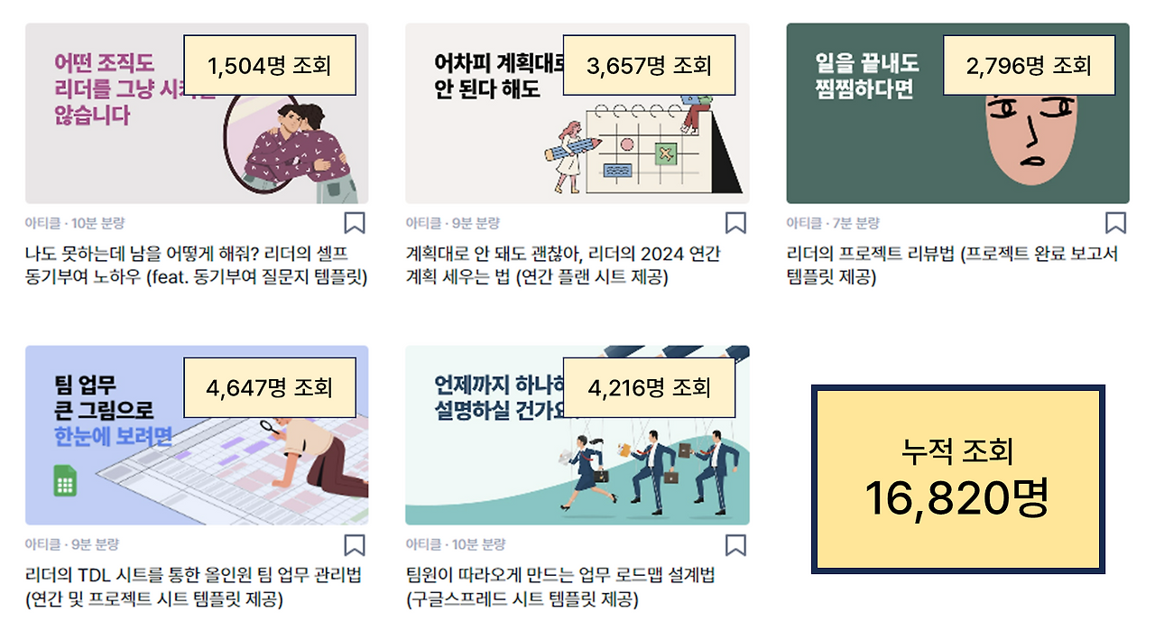 나는 1년 동안 총 5개의 아티클을 연재했다. 감사하게도 첫 아티클부터 인기 TOP10 안에 들더니, 모든 아티클이 인기 TOP10을 찍었고 TOP 1에 여러 차례 등극하기도 했고, 그동안 내 글을 읽은 사람만 16,800여명이 넘었다.