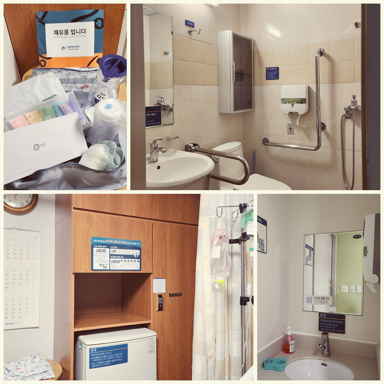 짧은 입원 기간이기도 하고, 9년 전 암수술 때 1인실의 좋은 점을 경험한터라 이번에도 1인실에 입원했다. 나는 수술을 받으러 가느라 수술이 끝나고 나서 입원실을 처음 봤고, 간병을 해준 동생이 먼저 1인실 곳곳의 사진을 찍어놨다. 필수품들이나 세안용품 등 세세한 어메니티들도 있어서 여러모로 도움이 되었다. 특히 빨대가 있는 물병은 최고...!