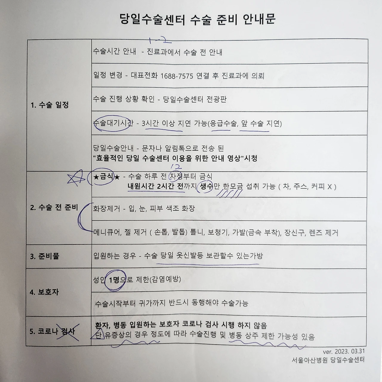 나는 당일 수술 후 입원으로 진행이 되어서 2박 3일 입원이긴 했지만, 왠지 1박 2일 같은 느낌이었다. 아산병원은 진행 과정에 대한 안내가 여러번 상세하게 진행되다 보니 여러모로 불안함이 상쇄되어서 좋았다.