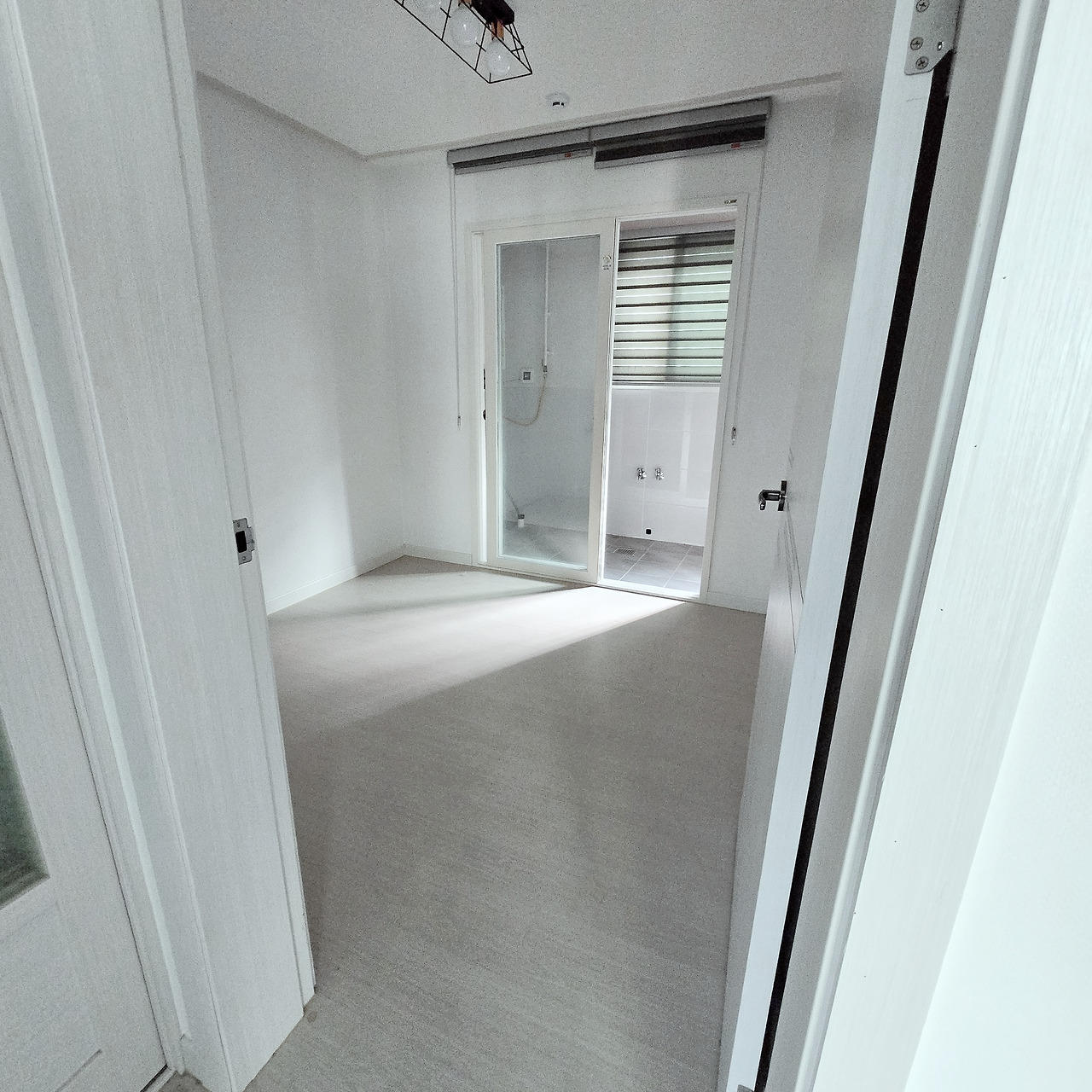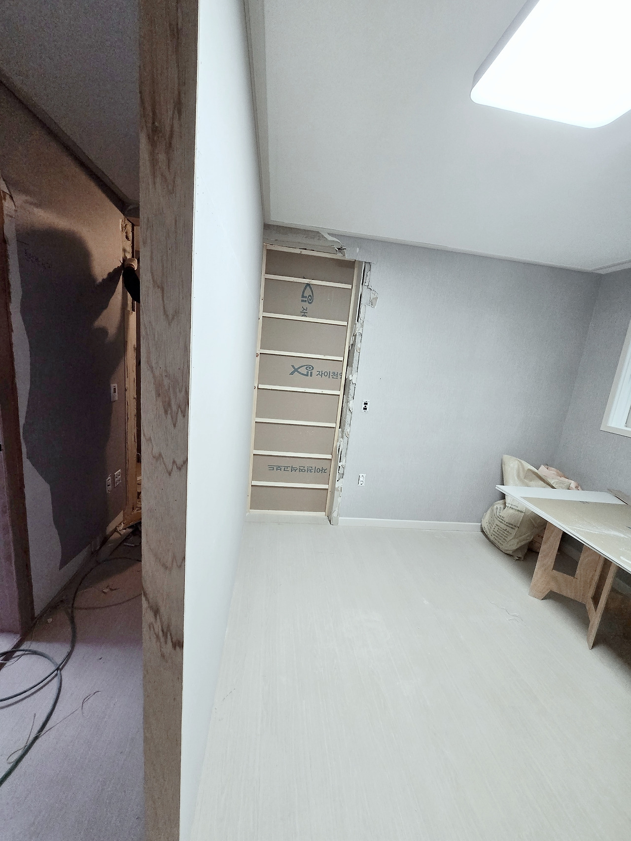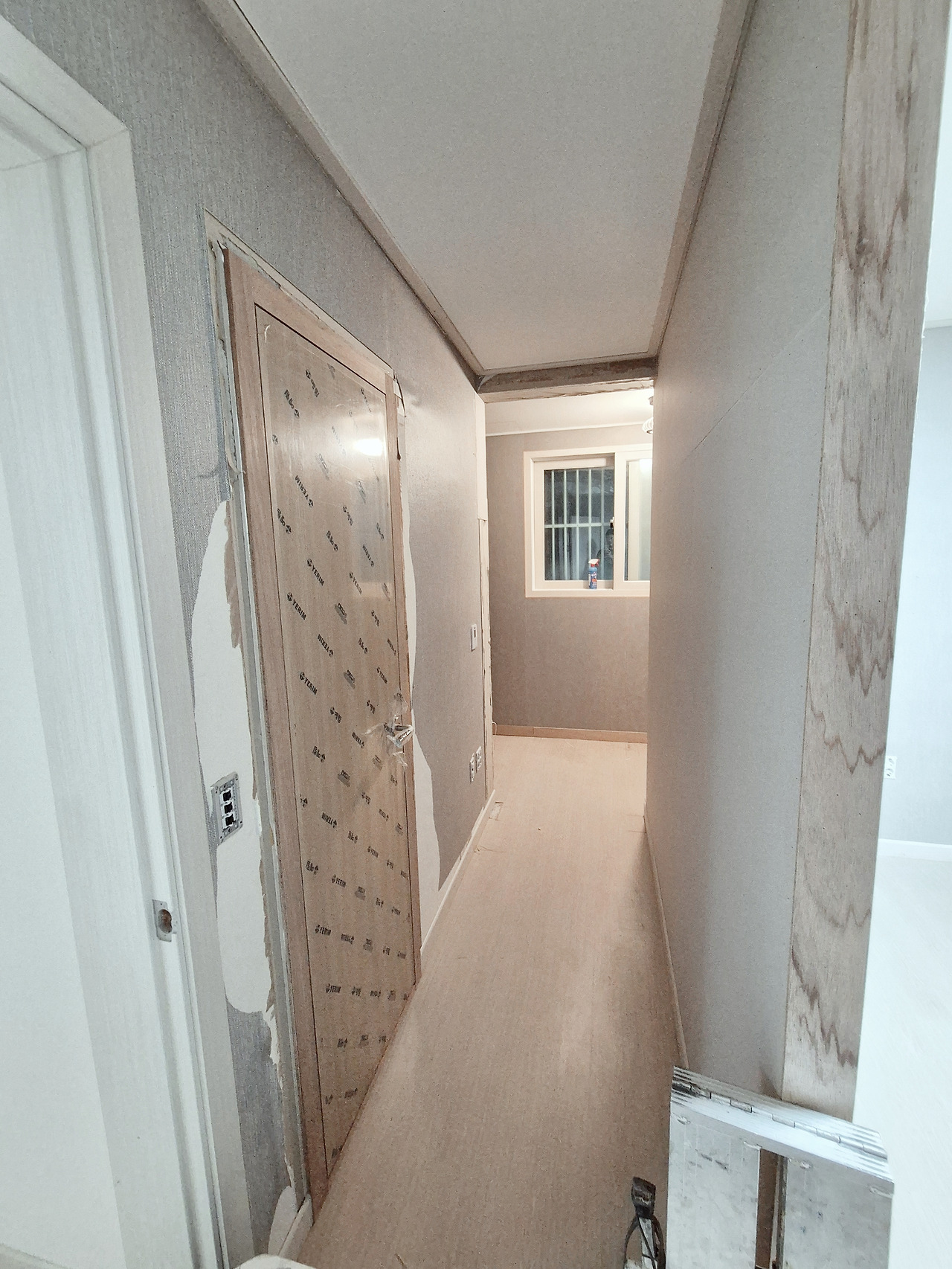 가벽을 세우거나 붙박이장을 만드는 등의 추가하는 작업이 끝나고 나서, <4. 화이트 우드 컨셉이어야 한다.>를 반영하기 위해 문틀과 벽 등에 우드 시트지, 화이트 벽지 시공을 시작했다. 문도 교체했다.