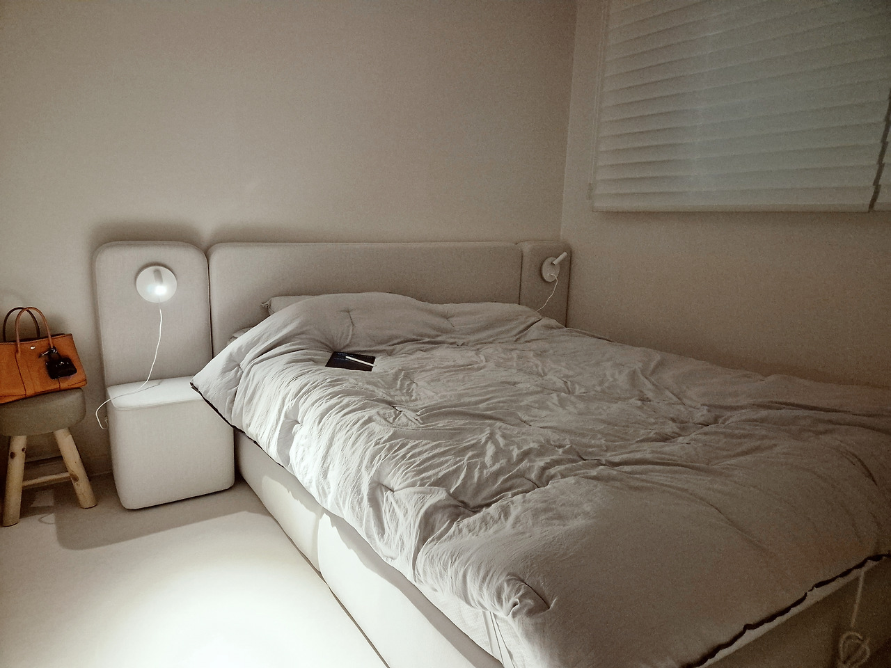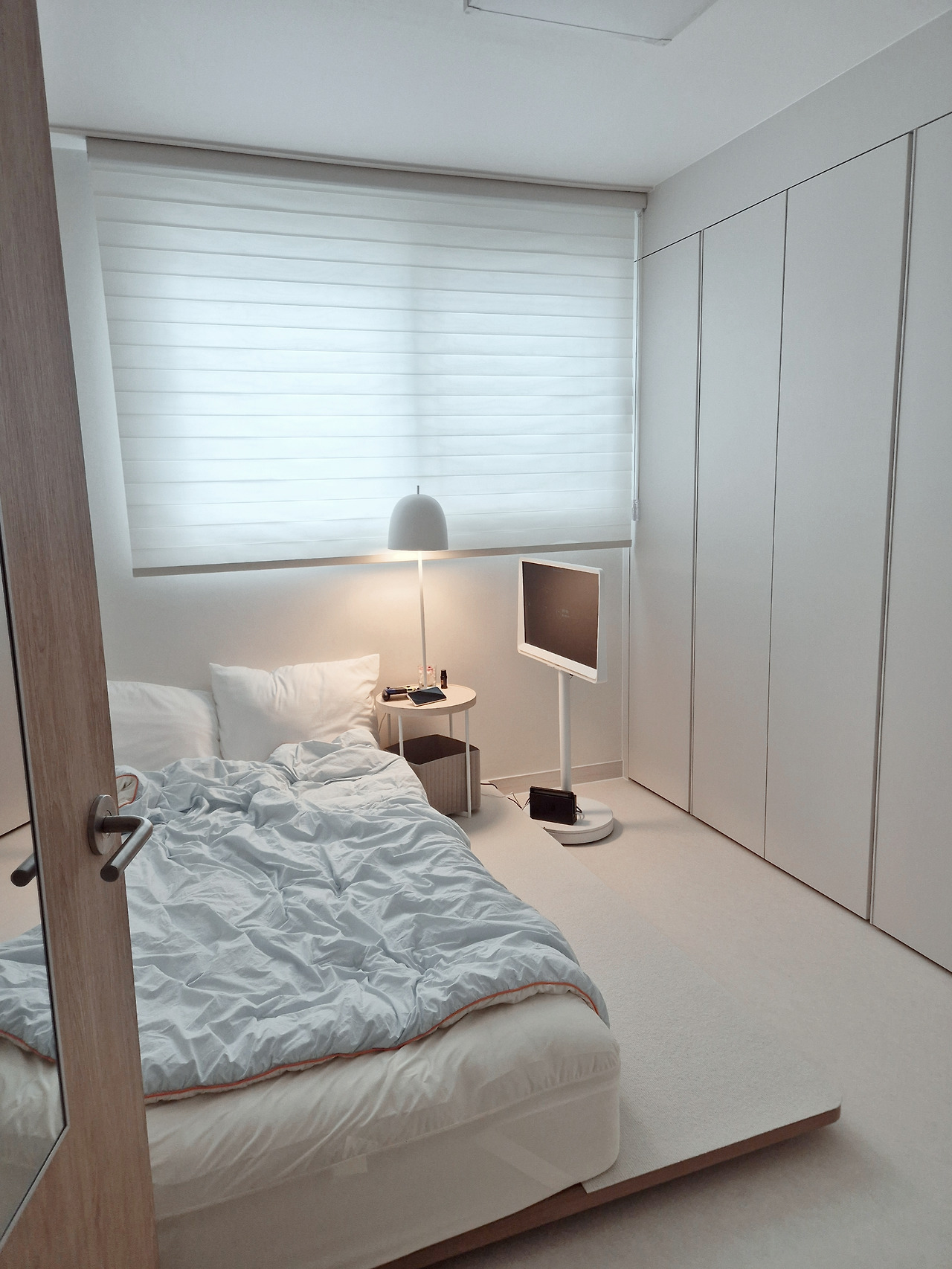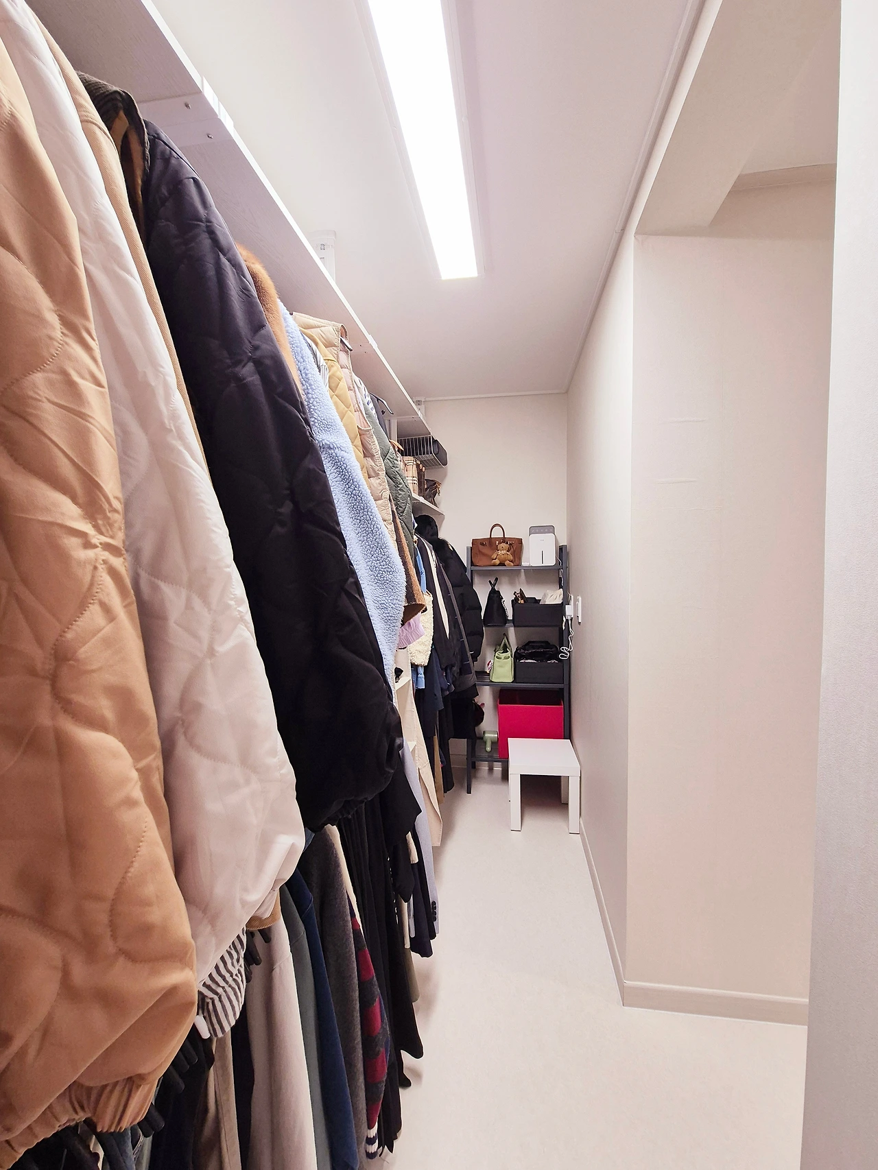 우리집은 안방이 신기할 정도로 매우 컸는데, 조금 더 안정감 있게 공간을 구성하기 위해 가벽을 세워 드레스룸과 침실 공간을 분리했다. 드레스룸 부분은 원래의 붙박이장을 떼어내고 시스템 붙박이 가구를 들였다.